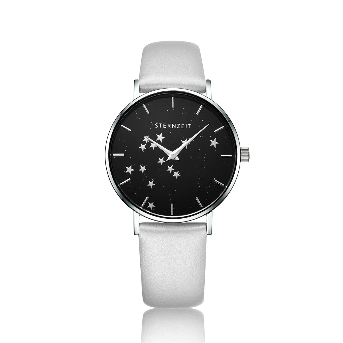 Sterne unterschiedlicher Größe glänzen auf dem dunklen Zifferblatt, welches wie ein Weltraum aussieht. Diese Uhr besitzt ein Gehäuse aus glänzendem Edelstahl und einem weichem, hochwertigen Lederband.