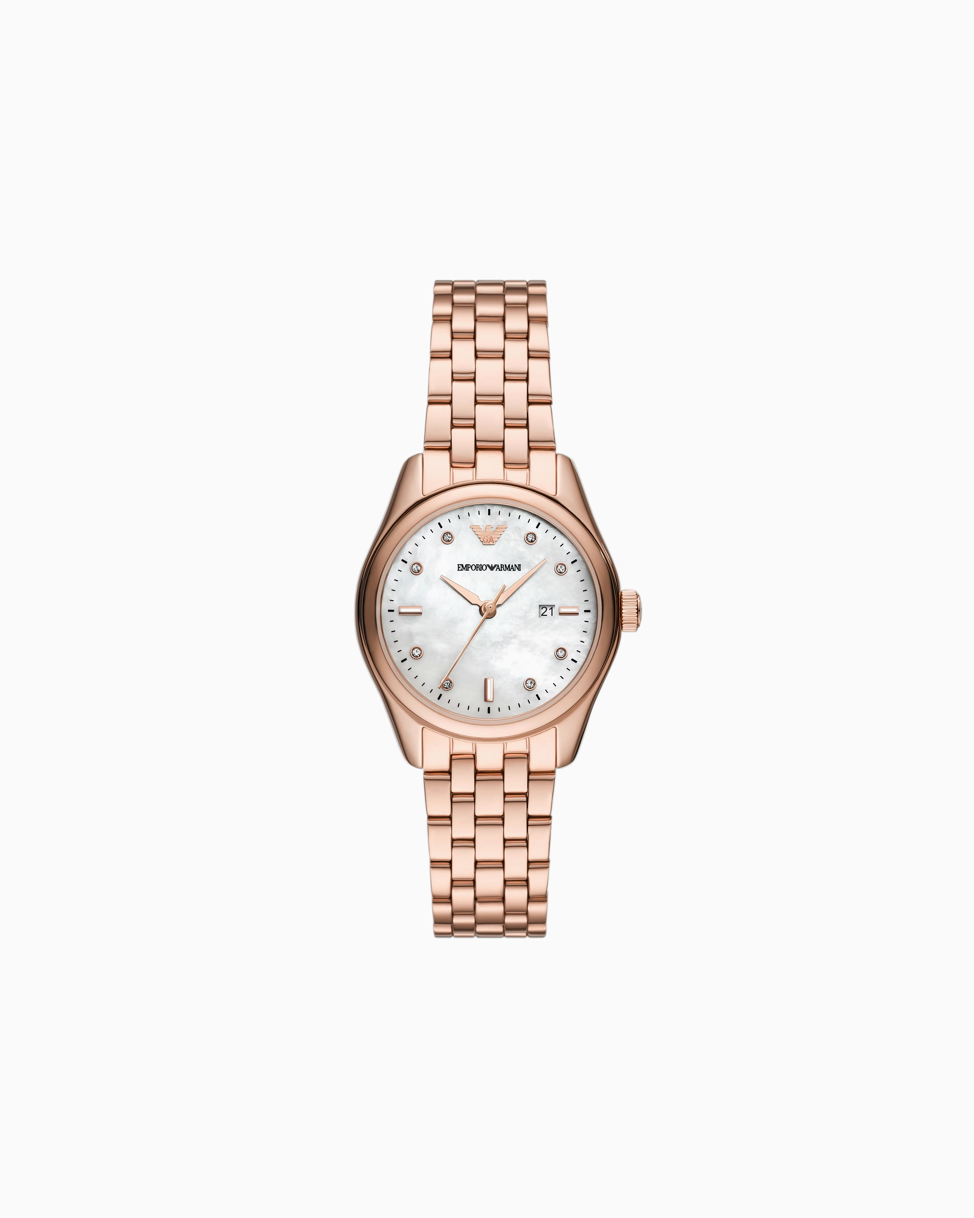 Diese 32-mm-Uhr verfügt über ein weißes Perlmuttzifferblatt, ein Datumswerk mit drei Zeigern und ein roségoldfarbenes Edelstahlarmband.