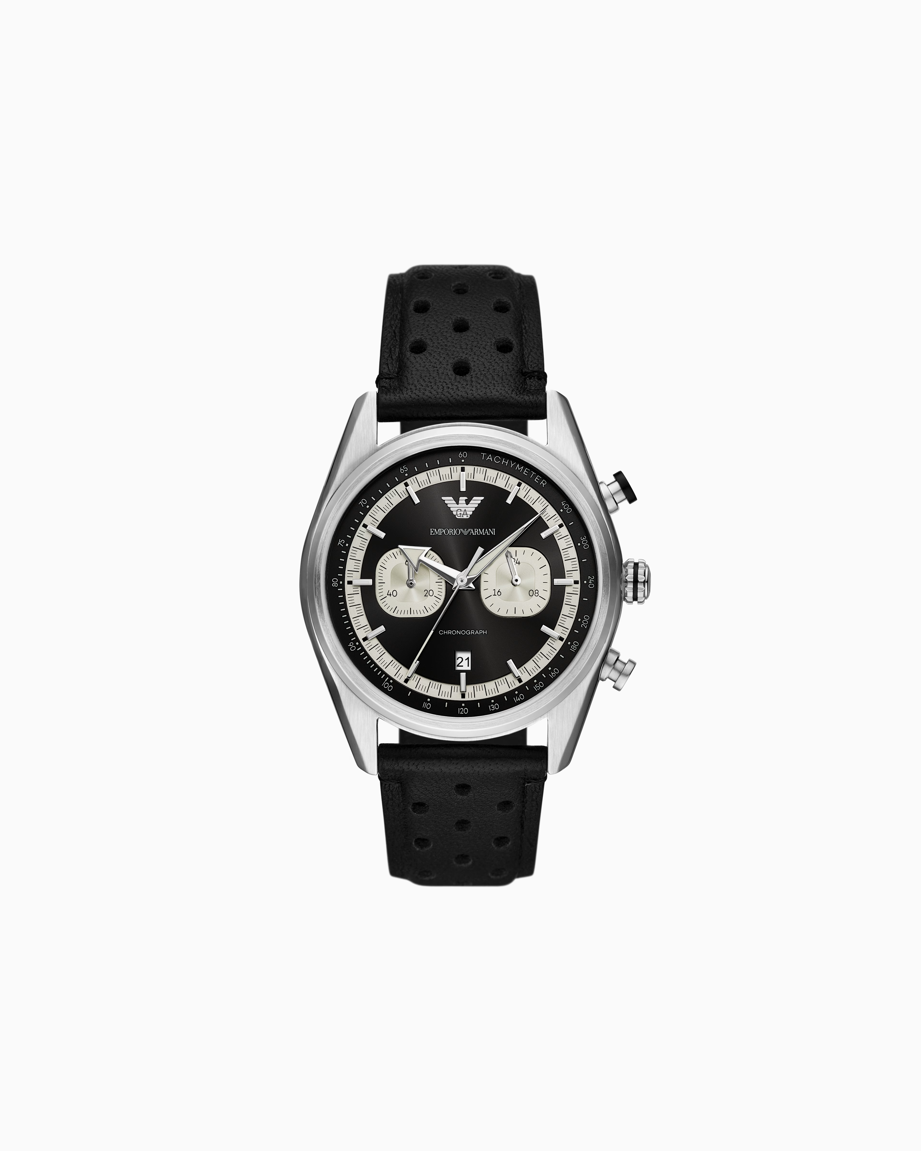 42 mm große Uhr mit schwarzem Sonnenschliff-Zifferblatt, cremefarbenen Hilfszifferblättern und CD-Effekt-Finish, Chronographenwerk und perforiertem Armband aus Leder in Schwarz