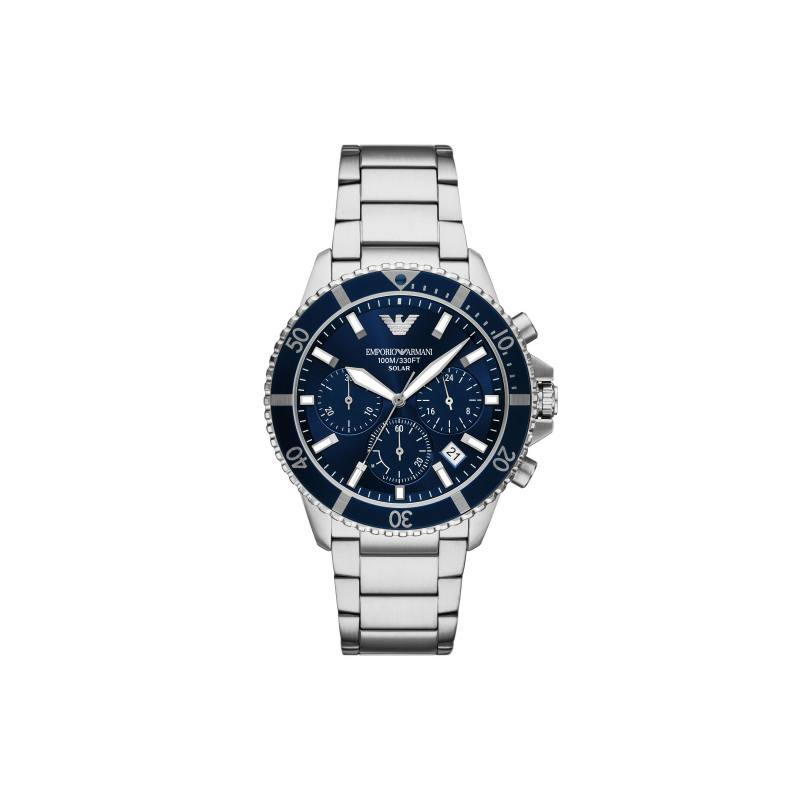 Diese 43 mm große Uhr verfügt über ein blaues Sonnenschliff-Zifferblatt, ein Chronographenwerk sowie ein Edelstahlarmband.