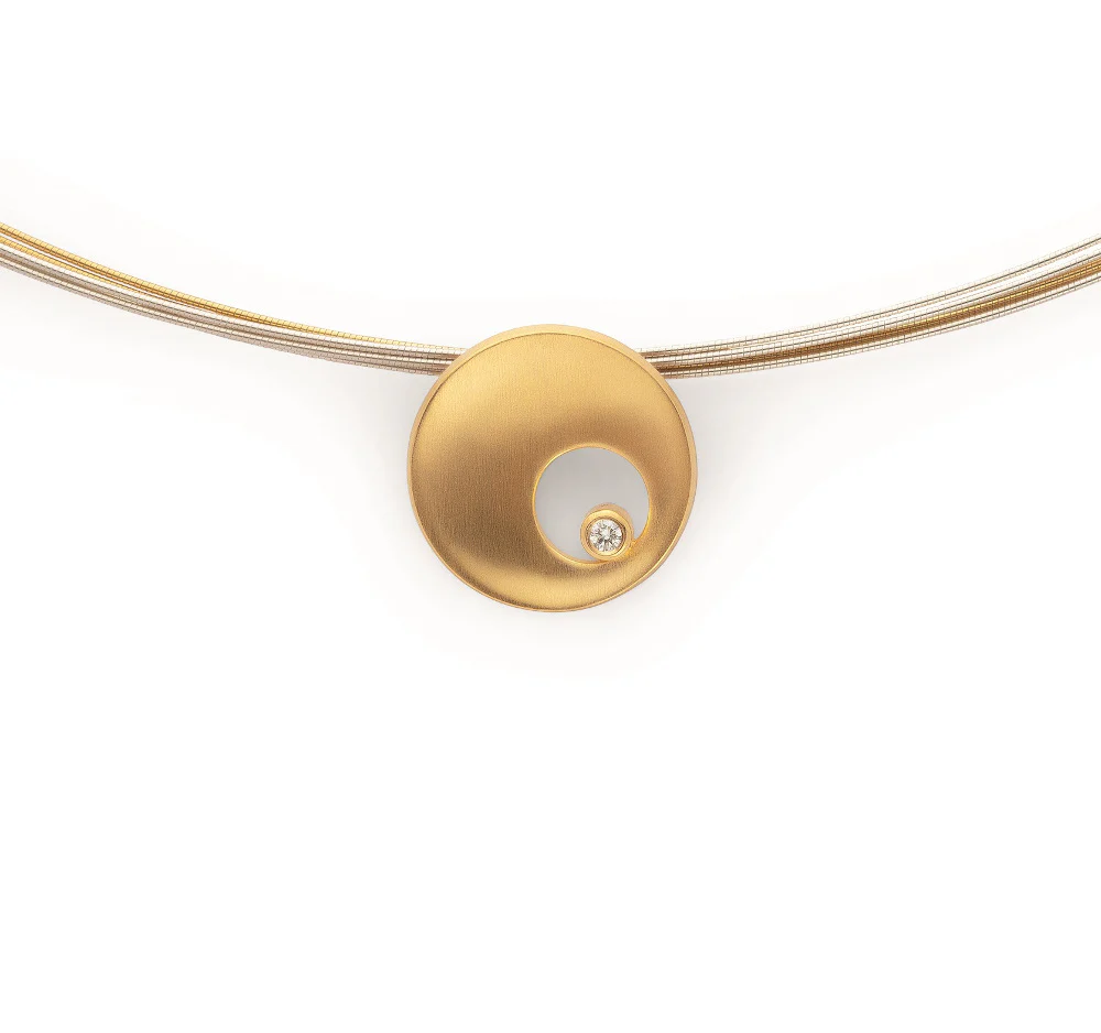 Wunderschöner, 18 Karat gelbvergoldeter Anhänger "Pantheon" in einer runden, leicht konkaven Ausführung. Gekrönt wird dieses liebevoll gestaltete Schmuckstück durch einen Diamanten im wertigen Brillantschliff mit 0,02ct (W-SI), welcher asymmetrisch in einem Cut-Out platziert wurde. Das Spiel aus Geometrie und Positionierung macht dieses Designschmuckstück zu einem attraktiven Hingucker. Mit passenden Ohrsteckern erhältlich. Wir empfehlen für diesen Anhänger den bicoloren Mehrstrang-Reif 41520.
