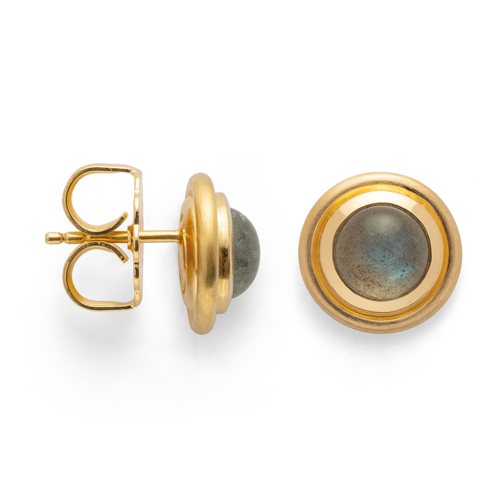 18 Karat gelbvergoldetes, mattiertes und poliertes 925/- Sterlingsilber trifft auf einen zauberhaft changierenden Labradorit mit 2,77 Karat. Ein wertig gearbeitetes Designschmuckstück mit Unikatcharakter, welches für die Ewigkeit geschaffen ist. Dieser Ohrschmuck wird mit einer großen Ohrmutter geliefert. Perfekt in Kombination mit dem dazugehörigen Anhänger und dem passenden Ring.