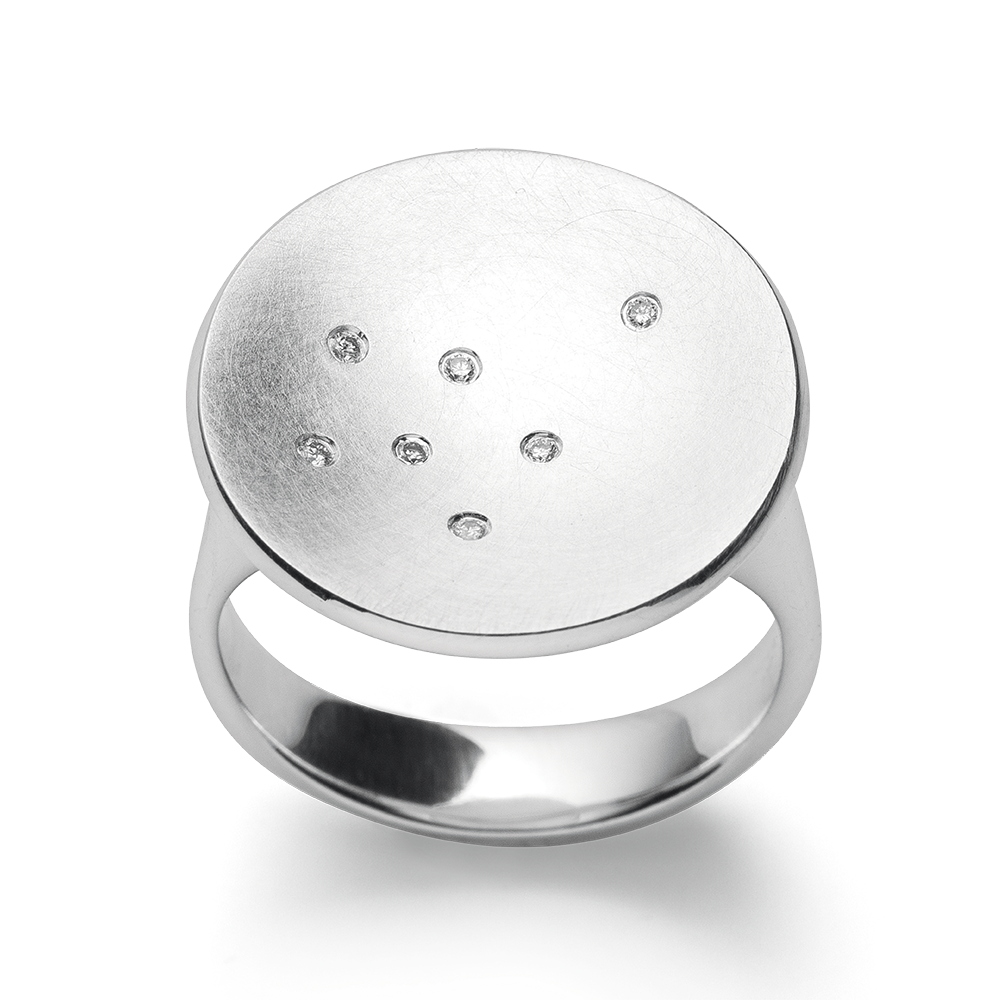 Ein an einen Sternenhimmel erinnerndes Funkeln und Schimmern trifft auf eine runde, nach innen gewölbte Formgebung: Dieser in Handarbeit gefertigte Ring aus mattiertem und poliertem 925/- Sterlingsilber mit insgesamt 7 ganz unterschiedlich arrangierten Diamanten (insgesamt 0,035ct) ist ein wahres Highlight der neuen bastian inverun Kollektion.