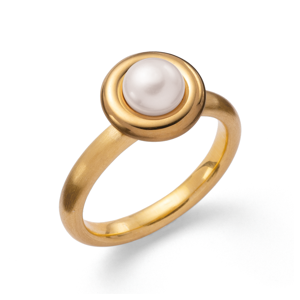 Dieser edle, vergoldete Ring aus mattiertem und poliertem 925/- Sterlingsilber bringt die weiße Zuchtperle (1,53ct) als Symbol zeitloser Schönheit perfekt zum Ausdruck. Ein schlichtes und zugleich elegantes Schmuckdesign der Designerin Nadine Resch. Auch in Kombination mit den passenden Ohrsteckern, dem passenden Anhänger und dem dazugehörigen Armband erhältlich.