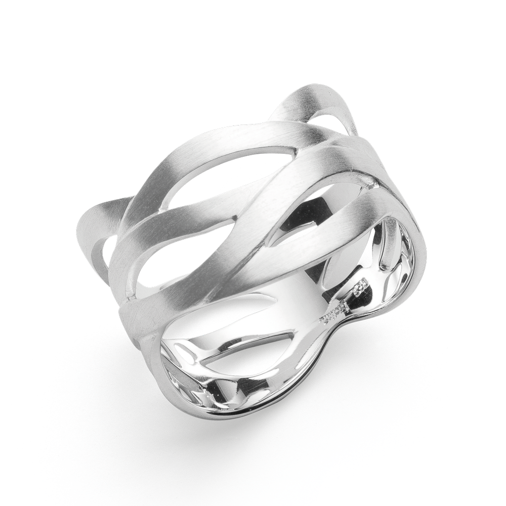 Mattiertes 925/- Sterlingsilber formt sich zu einem dynamisch Designring "Flexible Swing" aus der Feder der deutschen Designerin Dr. Sabine Brandenburg-Frank. Die wertvoll-massive Verarbeitung und das sportlich-elegante Design verleihen dem Ring eine einzigartige Ausstrahlungskraft. Ob für den Alltag oder für ein besonderes Event – dieser Designring überzeugt für jeden Anlass!