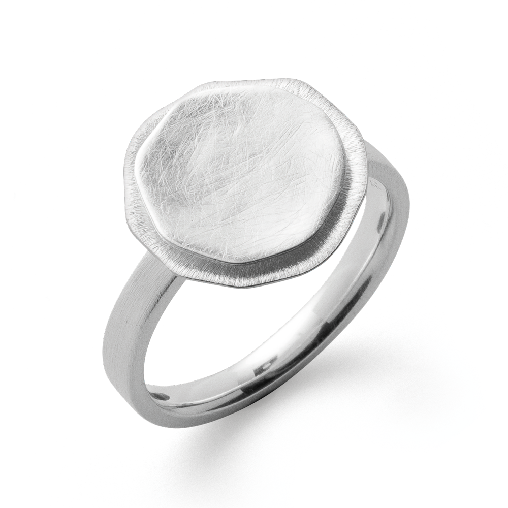 Geometrisch inspirierter Ring aus 925/- Sterlingsilber mit durchweg charakteristischer Oberflächengestaltung. Feine Linien werden von Hand mit Spezialbürsten in die Oberfläche eingearbeitet. Ein wahres Statement-Schmuckstück aus der Feder des Osnabrücker Designers Dietmar Sebastian, welches insbesondere durch die handwerkliche Ausstrahlung zum besonderen Hingucker wird. Erhältlich mit passendem Ohrschmuck