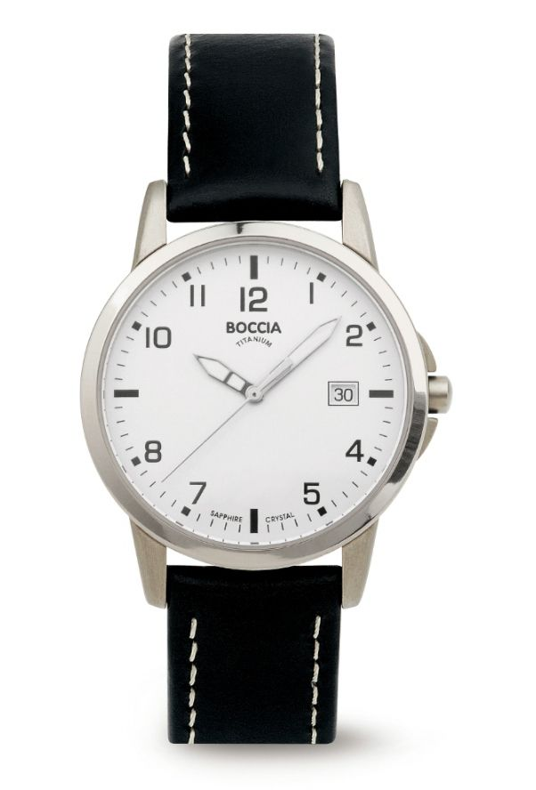 Boccia Herrenuhr mit Gehäuse aus antiallergischem Reintitan. Das kontrastreich gestaltete Zifferblatt sorgt für beste Ablesbarkeit. Die Zeiger sind mit einer nachleuchtenden Leuchtmasse versehen. Das hochwertige Echtlederarmband sorgt für maximalen Tragekomfort.
