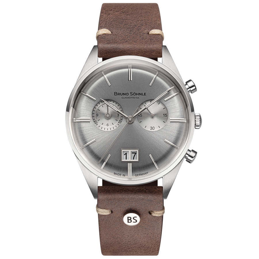 Der Merano Chronograph kombiniert elegantes Design mit praktischer Funktionalität. Auf dem silberfarbenen, gewölbten Zifferblatt mit Sonnenschliff finden sich zwei Hilfszifferblätter: Der Totalisator bei 3 Uhr zeigt die kleine Sekunde an, während der zentrale Sekundenzeiger der Stoppsekunde weicht. Auf 9 Uhr befindet sich ein weiterer Totalisator, der mit zwei Zeigern ausgestattet ist, um die gestoppten Minuten und Stunden präzise anzuzeigen. Ein Großdatum bei 6 Uhr, bestehend aus zwei separat schaltenden Datumsscheiben, erinnert an die berühmte 5-Minuten-Uhr der Dresdner Semperoper. Das 40 mm Edelstahlgehäuse wird durch ein weiches Mokka-Lederarmband ergänzt. Durch den Glasboden kann man das sorgfältig veredelte Schweizer Kaliber Ronda 5020.B betrachten. Dieses Uhrwerk wird im Haus durch Demontage, Veredelung mit Glashütter Streifenschliff und thermisch gebläuten Schrauben sowie anschließender Remontage auf höchstem Niveau perfektioniert.