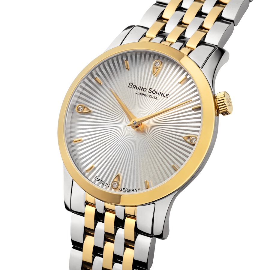 Die Bologna IV in der bicolor-Version kombiniert Edelstahl mit partieller IP-Gold-Beschichtung, was ihr ein modernes und elegantes Aussehen verleiht. Mit einem Gehäusedurchmesser von 28,5 mm und einem silbernen Zifferblatt, das durch einen Wellenschliff und vier brillante Tropfen-Indizes verziert ist, bietet diese Uhr sowohl Stil als auch Funktionalität. Die Krone auf der 2-Uhr-Position bleibt ein hervorstechendes Designelement. Das Edelstahlband sorgt für Tragekomfort, während das Ronda 1062 Uhrwerk, veredelt in Glashütte, präzise Zeitmessung gewährleistet.