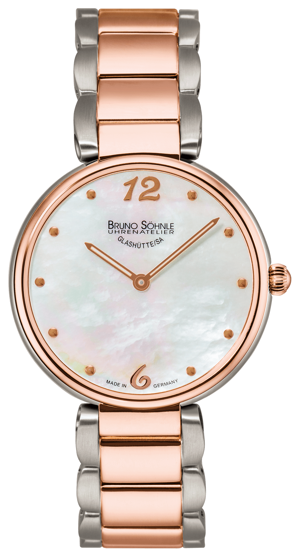 Quarzwerk (Basiswerk Ronda 1062), Edelstahl bicolor IP rose, Ø 32,5 mm, Höhe 5,85 mm, 3 bar, Saphirglas innen entspiegelt, Edelstahl bicolor IP rose, Faltschließe