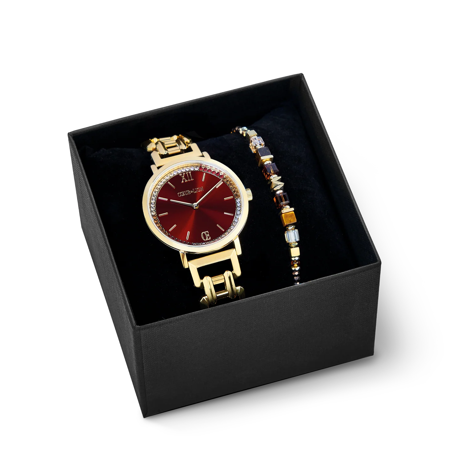 Geschenkset Uhr Rund Sparkling Festive Red & Armband Wave Cube Flow gold-braun