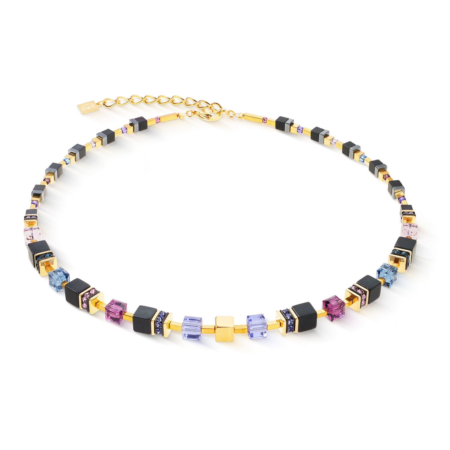 Klassisches Design trifft auf kraftvolle Farbakzente: Die 6 mm großen GeoCUBE® Würfel in Nachtblau, Violett, Rosé und Ice Blue vereinen sich mit tiefschwarzem Onyx und funkelnden Kristallen zu einem markanten Gesamtbild. Feine, quaderförmige Elemente aus goldveredeltem Hämatit setzen elegante Akzente zwischen den Steinen. Nach hinten sanft verjüngt für optimalen Tragekomfort – ein Schmuckstück mit Raffinesse.