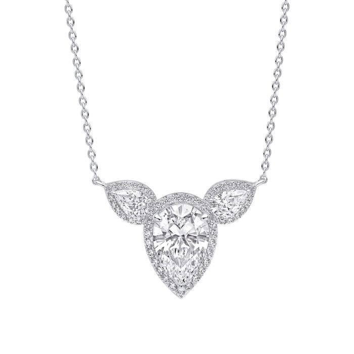 Setzen Sie ein schillerndes Statement mit dieser atemberaubenden Halskette, die bei jeder Bewegung Glamour und Eleganz ausstrahlt. Diese Halskette besteht aus drei tropfenförmigen Diamonfire-Zirkonia-Steinen, die jeweils von einem funkelnden Heiligenschein umhüllt sind, und fängt das Licht aus jedem Winkel ein. Diese Halskette aus Sterlingsilber mit einer dreifachen Beschichtung aus Platin, Palladium und Rhodium bietet ein strahlendes Finish, das lange hält. Das fließende Tropfendesign unterstreicht die Brillanz und macht sie zur perfekten Wahl für Black-Tie-Veranstaltungen, Hochzeiten oder jeden Anlass, bei dem nur der raffinierteste Glanz ausreicht, insbesondere wenn er mit den passenden Ohrringen getragen wird.