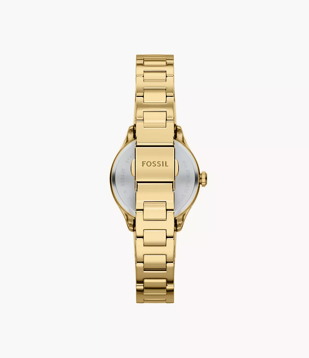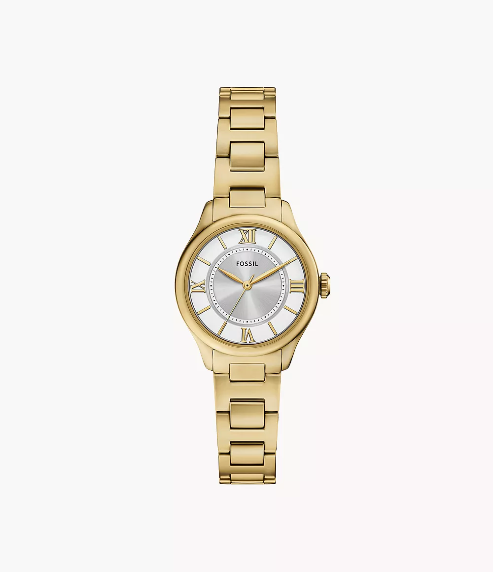 Diese Uhr hat ein goldfarbenes Edelstahlband und ein rundes Gehäuse für einen eleganten und stimmigen Look. Das silberfarbene Zifferblatt ist mit einem satinierten Sunray-Finish versehen, das das Licht einfängt und dem minimalistischen Design mit 3-Zeiger-Werk Tiefe verleiht. Diese sorgfältig aus hochwertigen Materialien gefertigte Uhr verbindet raffinierte Details mit dezentem Design und ergänzt jede Garderobe.