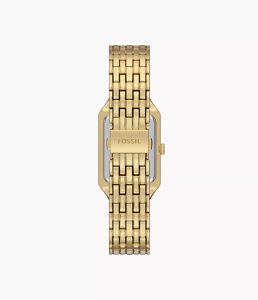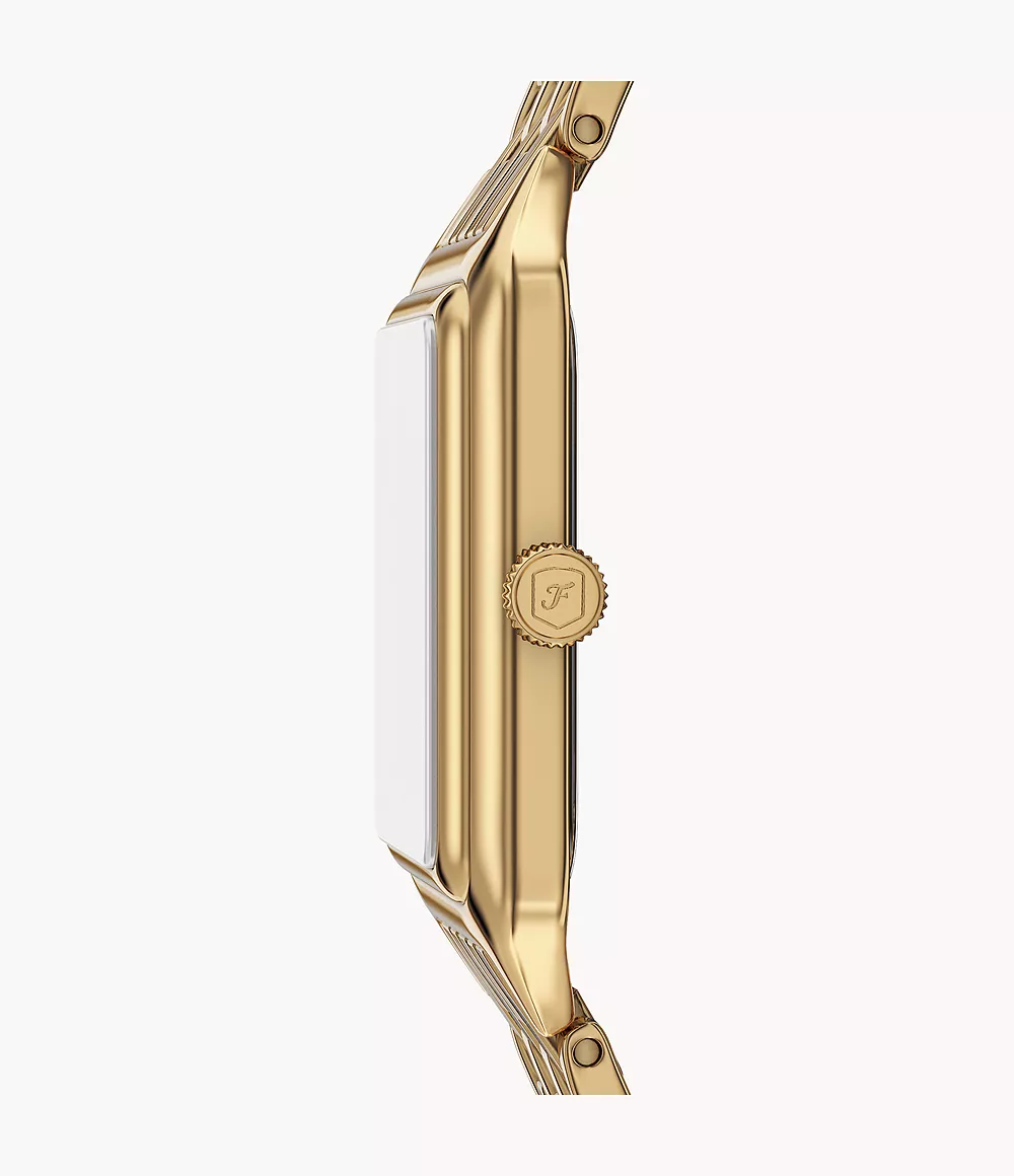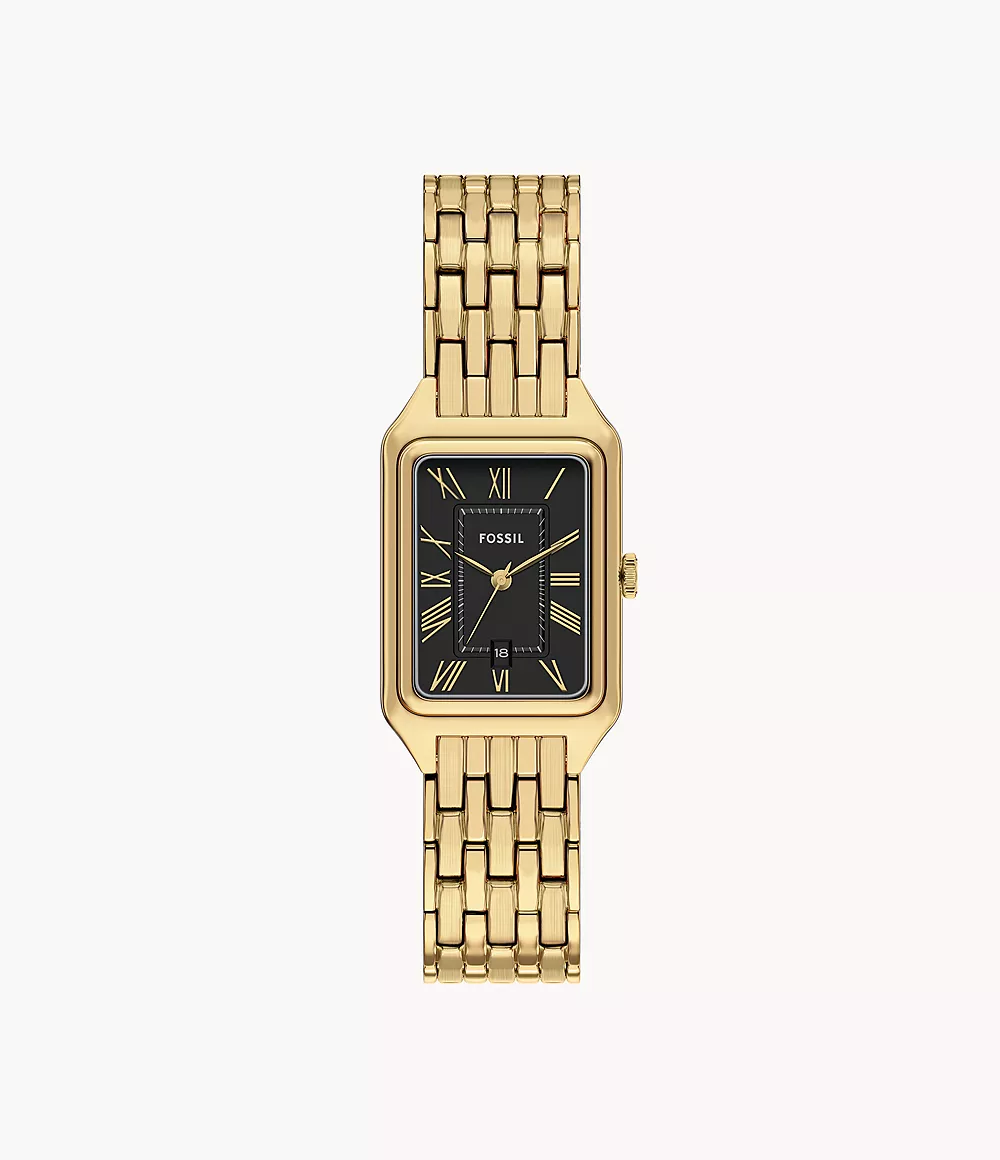 Diese goldfarbene Uhr besitzt ein rechteckiges Edelstahlgehäuse und ein passendes Edelstahlband für ein stimmiges Design. Das satinierte schwarze Zifferblatt sorgt für Tiefe und Kontrast, ergänzt durch eine Drei-Zeiger-Anzeige und eine Datumsanzeige für zusätzliche Funktionalität.