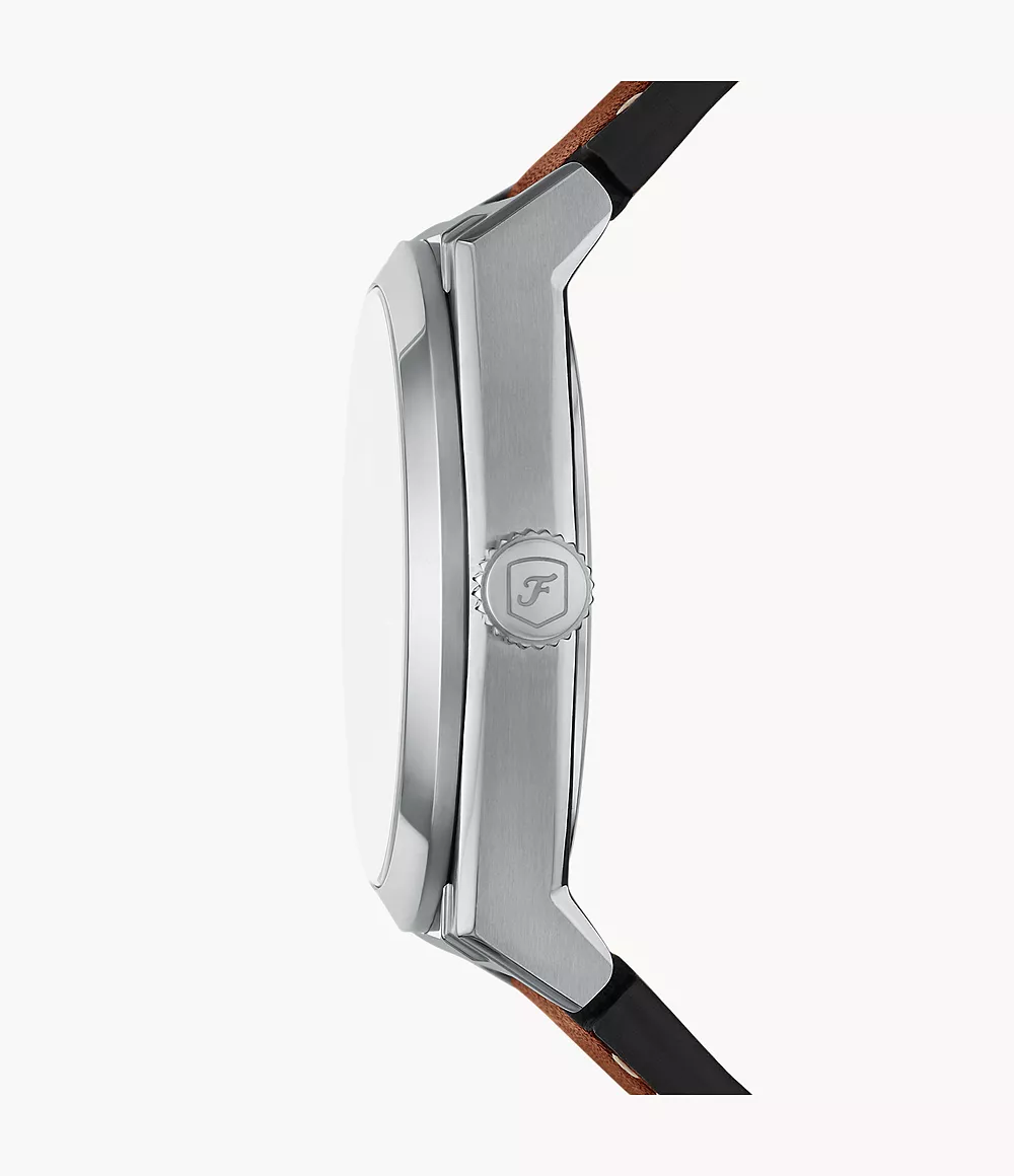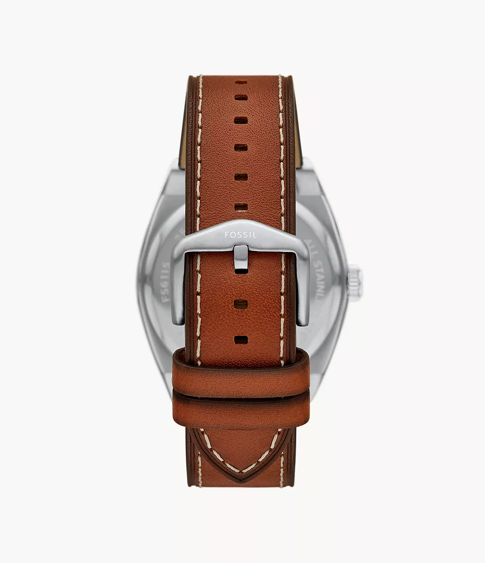 Diese Uhr Everett ist sportlich und raffiniert zugleich. Das ausgefallene blaue Sunray-Zifferblatt ist in ein rundes 42-mm-Edelstahlgehäuse eingebettet. Dazu gehören ein klassisches 3-Zeiger-Werk mit Datumsanzeige und ein braunes Lederband. Trage die Uhr solo als Statement-Piece oder elegant kombiniert. Lederprodukte von Fossil unterstützen eine nachhaltige Herstellung durch die Leather Working Group (LWG).