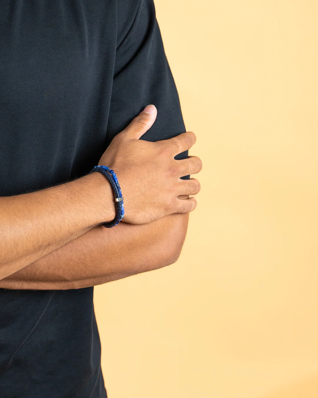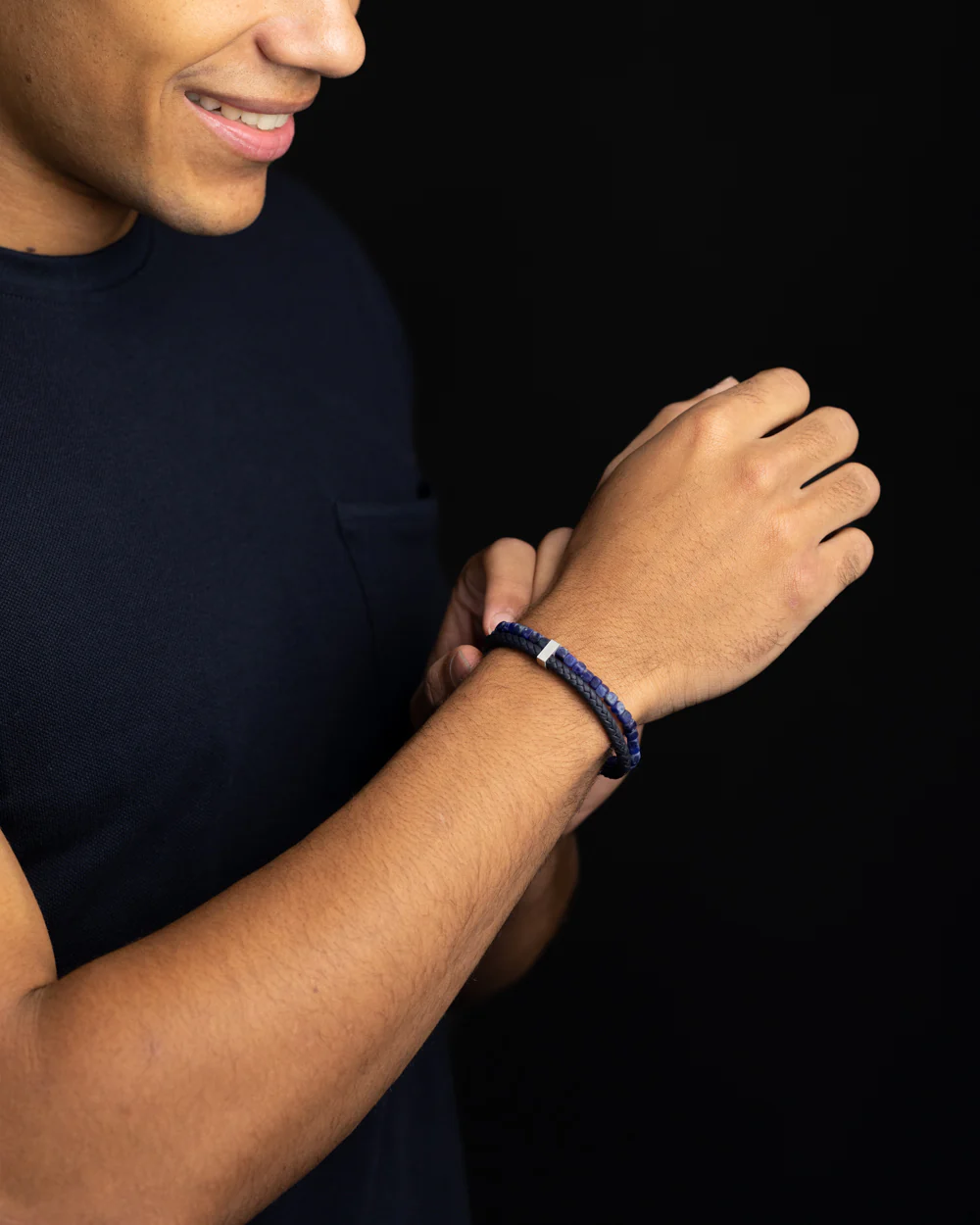 Das für diesen Double Blue verwendete blaue Leder ist wirklich außergewöhnlich: Es wird in der Toskana, Italien, von Hand gewebt. Sie werden den Unterschied zu jeder Lederart, die Sie jemals ausprobiert haben, deutlich spüren. Das Armband ist mit 4 mm Sodalith-Steinen veredelt. Dieser Stein besteht aus einem eher seltenen Mineral, das für seine blaue bis violettblaue Farbe bekannt ist. Manchmal ist es durch weiße Adern oder Flecken gekennzeichnet, die durch den Stein verlaufen. In Gegenwart dieses Natursteins wird Ihr Selbstbewusstsein gestärkt und Ihr Selbstwertgefühl verbessert.