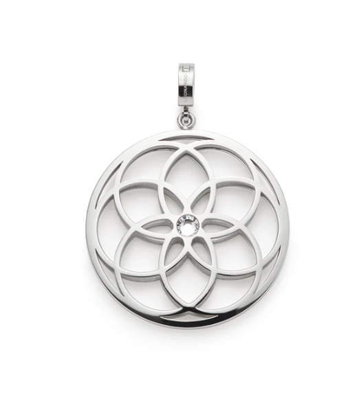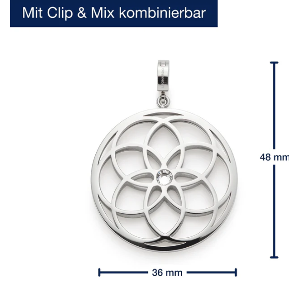Ein Hauch von Eleganz und Moderne, der dich strahlen lässt – dieser große, runde Anhänger aus Edelstahl ist ein echter Blickfang. Zwei leicht gewölbte Hälften treffen auf ein filigranes, blumenartiges Muster, das ihm einen modernen und zugleich eleganten Look verleiht. Der funkelnde Glasstein in der Mitte macht's rund – ein Highlight, das deinen Stil auf charmante Weise unterstreicht!