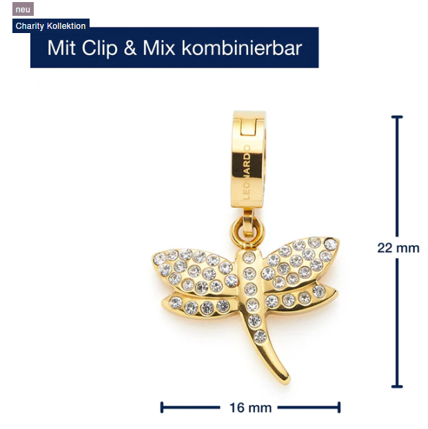 Ergänze deine Schmuck-Favorites mit diesem zauberhaften Libellen-Anhänger – ob im Kontrast zur kräftigen Ankerkette aus der gleichen Serie oder zu anderen Goldstücken. Die kleine, stilisierte Libelle ist mit ihrem Pavé-Besatz ein funkelnder Hingucker. Sie symbolisiert das Gefühl von Leichtigkeit, aber auch Veränderung und eignet sich daher auch wunderbar zum Verschenken. Zum Fixieren dient ein M-Clip.