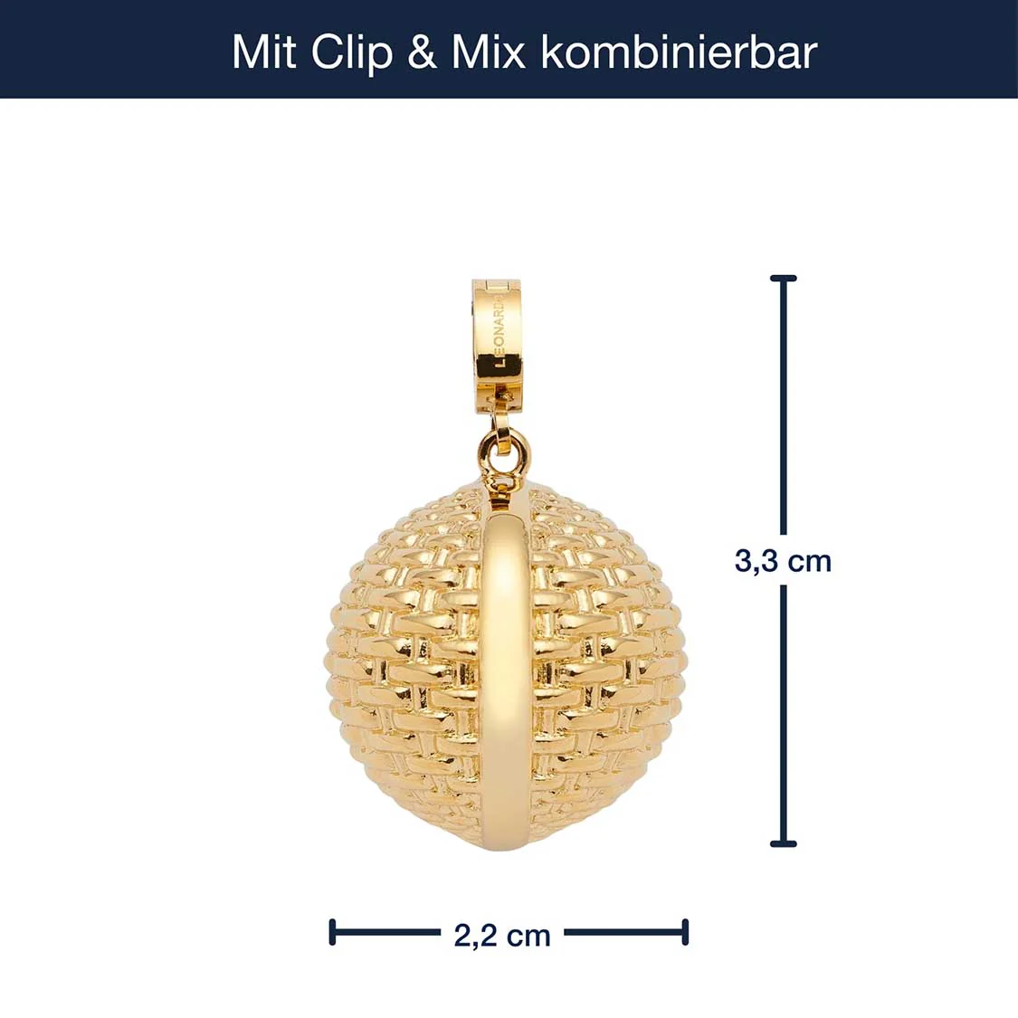 Der Anhänger PINOU ist pure Eleganz im Zeichen des Bold Elegance-Trends. Die polierte, goldene Kugel mit edler Flechtoptik macht diesen mittelgroßen Anhänger zu einem ausdrucksstarken Highlight. Ob als markanter Blickfang an Deiner Kette oder als stilvolle Ergänzung an einem Armband – mit dem Clip Größe M setzt Du klare, moderne Statements.