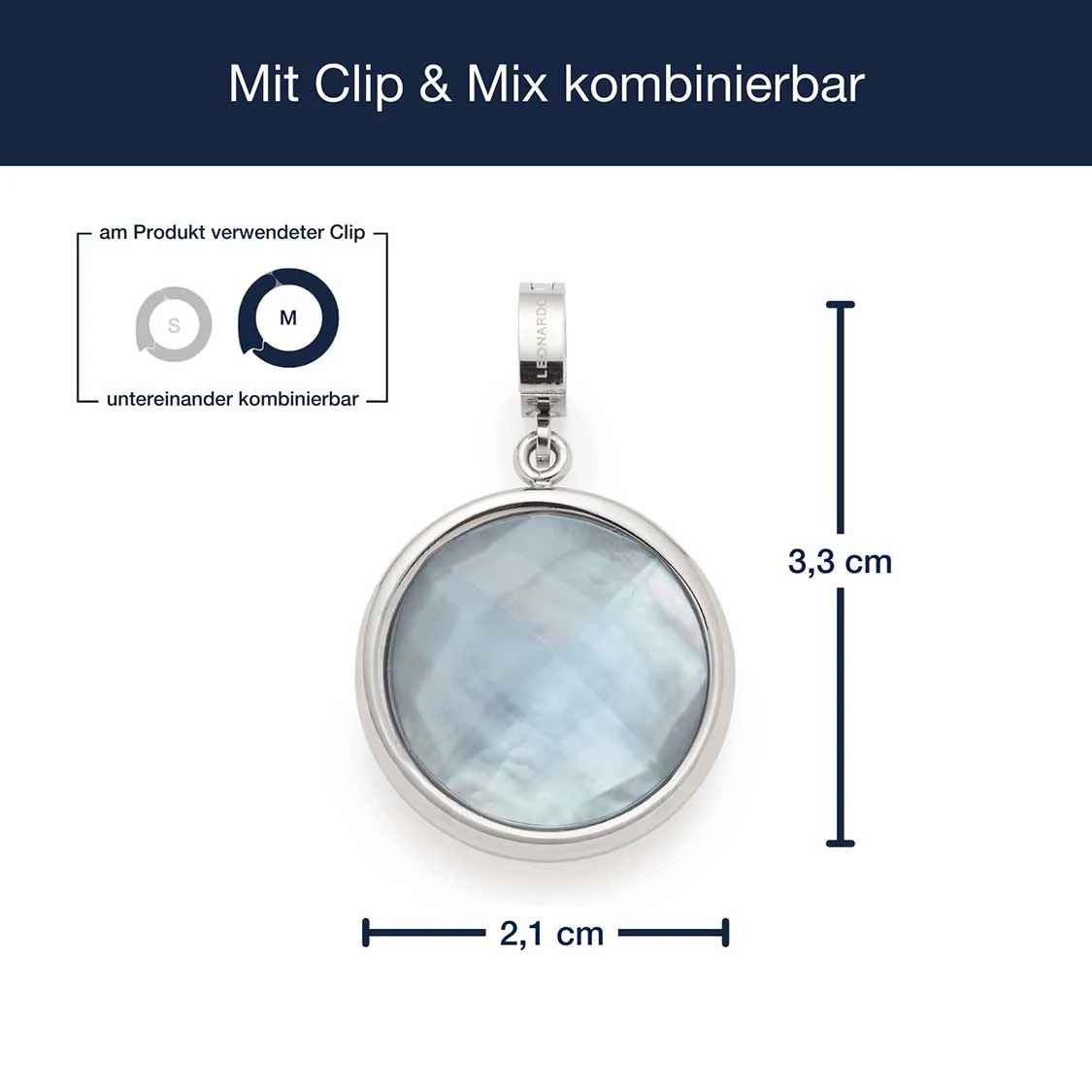 Der Anhänger MINKA begeistert durch seine dezente Eleganz und das harmonische Farbspiel. Der runde Anhänger aus poliertem Edelstahl kombiniert einen facettierten Glasstein in pastellblaugrau mit einer zarten Perlmutt-Unterlage, die für besondere Tiefe und sanft schimmernde Lichtreflexe sorgt. Die hochwertige Fassung betont den modernen, reduzierten Stil des Schmuckstücks und macht MINKA zu einem vielseitigen Begleiter – sowohl für den Alltag als auch für besondere Momente. Dank des Clips in Größe M lässt sich der Anhänger einfach an passenden Basis-Ketten oder -Armbändern befestigen und flexibel kombinieren.