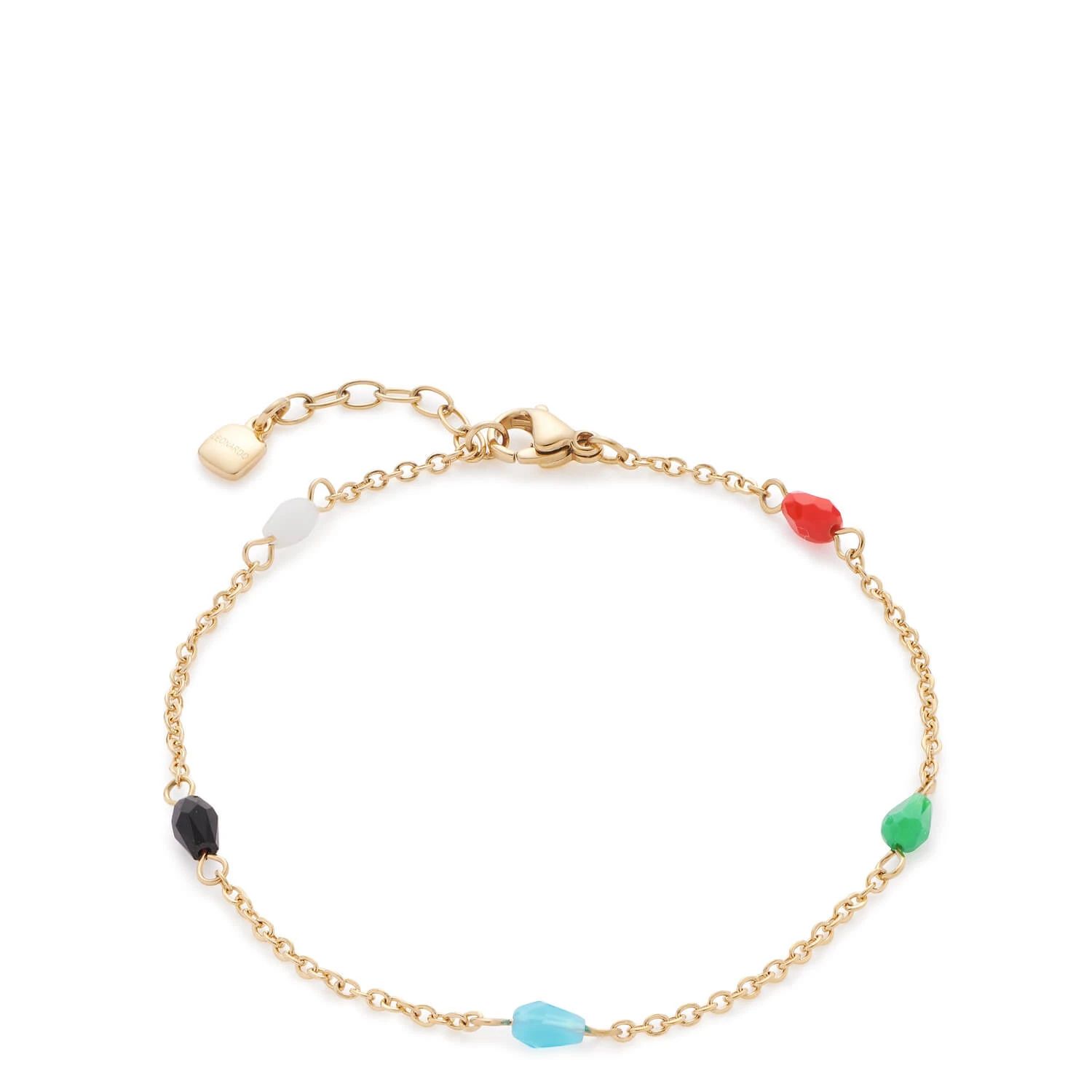Kunterbunt: Das filigrane, diamantierte Ankerkettchen beweist Mut zur Farbe und besticht im modernen Design mit glänzenden Glasperlen in allen Facetten des Regenbogens. Durch die fließenden Linien und weichen Rundungen der tropfenförmigen Glasperlen schmiegt sich das goldfarben ionenplattierte Armband angenehm an das Handgelenk an.