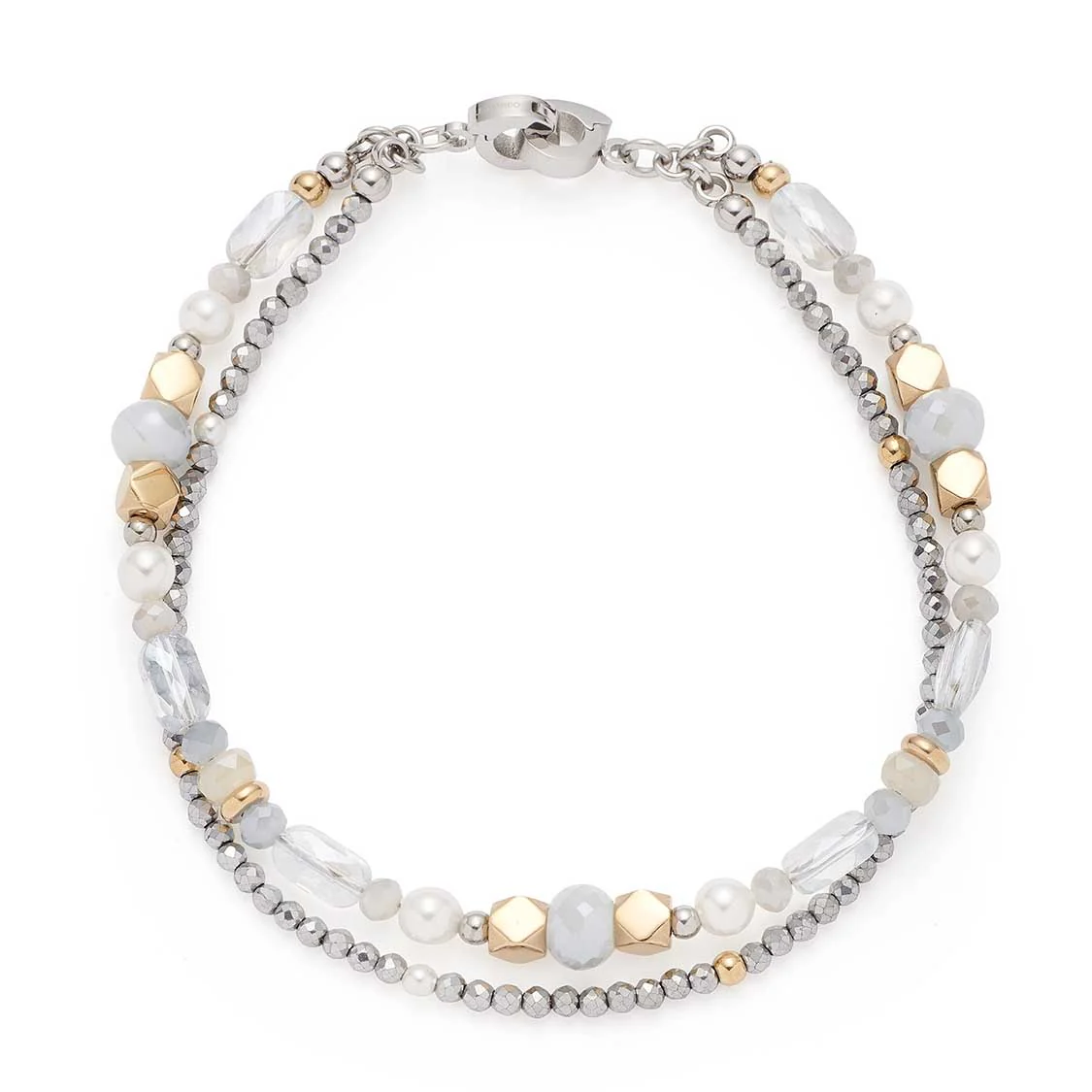 Das Armband ESTHER begeistert mit seinem filigranen, zweireihigen Design und feinen Farbnuancen. Es kombiniert Hämatit, blassblaue Glasperlen, goldene Elemente und kleine weiße Perlen zu einem eleganten, ausgewogenen Gesamtbild. Kleine Würfel und goldene Scheiben setzen dezente Highlights, während die Clip-Verbindungen das Armband funktional und wandelbar machen. Durch die Clip&Mix-Funktion kannst du das Schmuckstück individuell erweitern oder mit anderen Basisstücken verbinden – für einen einzigartigen, persönlichen Stil. Die hochwertige Verarbeitung sorgt für einen angenehmen Tragekomfort und einen edlen Look, der zu vielen Outfits passt.