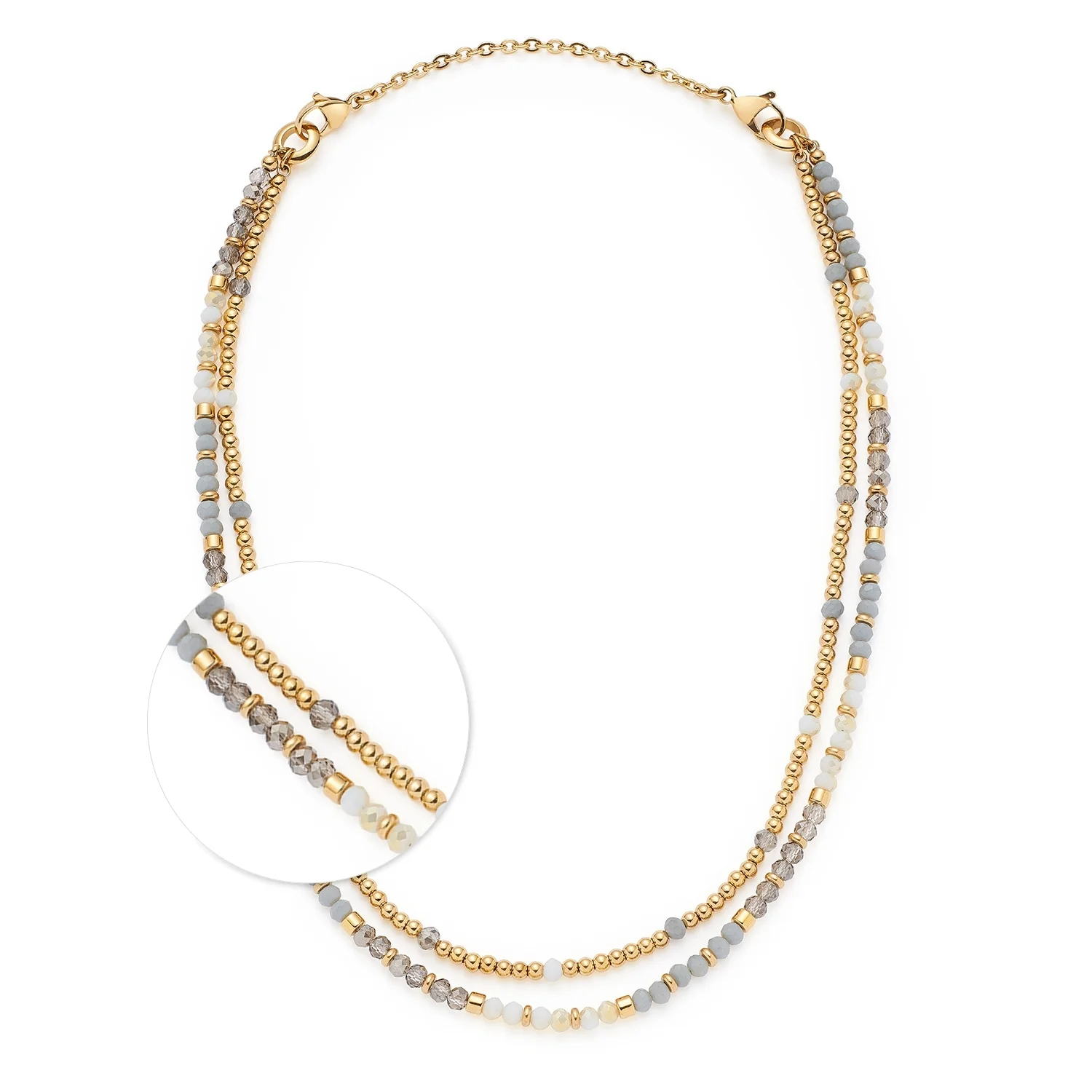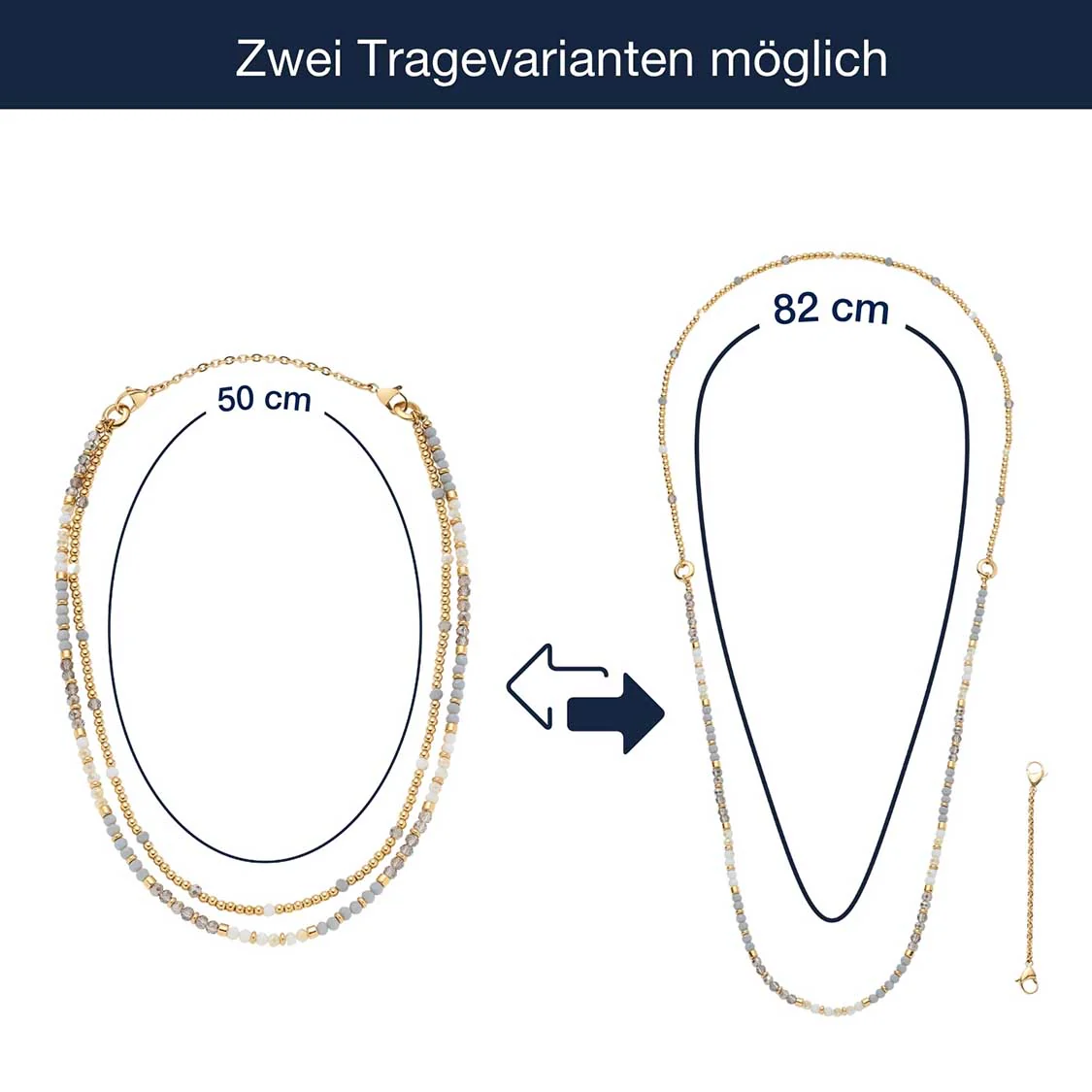 Verleihe Deinem Look eine stilvolle Tiefe mit dem edlen Collier BERNADETTE. Dieses atemberaubende Zierstück kombiniert sanft glänzende Goldkugeln mit schimmernden Glasschliffperlen in gebrochenem Weiß, mattem Grau und Rauchglas-Optik – ein Farbspiel, das durch Eleganz und Modernität besticht. Du kannst diesen Halsschmuck sowohl lang als auch doppelt tragen, indem Du ihn mit einem Adapter variierst – so passt er perfekt zu Deinem Outfit und Deiner Stimmung. Das Besondere: Die beiden kräftigen GoldRinge setzen ein markantes Statement und bieten gleichzeitig die Möglichkeit, passende Clip & Mix Anhänger einzuhängen. In Kombination mit dem passenden Armband BERNADETTE entsteht ein harmonisches Set, das Deinen persönlichen Stil unterstreicht.