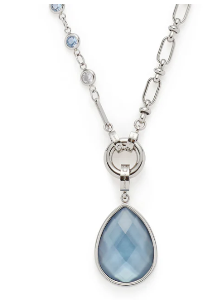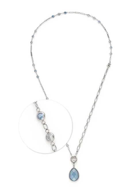 Warum nur ein Style, wenn man auch mehrere auf einmal haben kann. Diese Kette begeistert mit einem integrierten Armband sowie einem Anhänger, den du individuell kombinieren kannst. Ihr Mix aus blassblauen und weißen Glassteinen sowie länglichen Kettengliedern verbreitet eine sommerliche und sehr erfrischende Anmutung. Das Armband fügt sich optimal ein, kann aber auch rausgeclippt und anderweitig gestylt werden, ähnlich wie der Anhänger. Dieser Liebling kann jeden Tag neue gestylt und erfunden werden.
