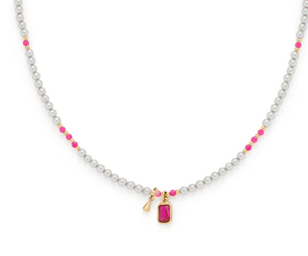 Pink Power! Diese Kette vereint zarte Details mit kräftigen Akzenten. Kleine Imitationsperlen in Hellgrau harmonieren perfekt mit filigranen Goldkugeln und lebhaften Glasperlen in strahlendem Pink. Ein besonderer Hingucker ist der pinke Baguettestein in der Mitte, der der Kette das gewisse Etwas verleiht. Ein perfektes Schmuckstück, das sowohl subtile Eleganz als auch kräftige Farben auf elegante Weise kombiniert.