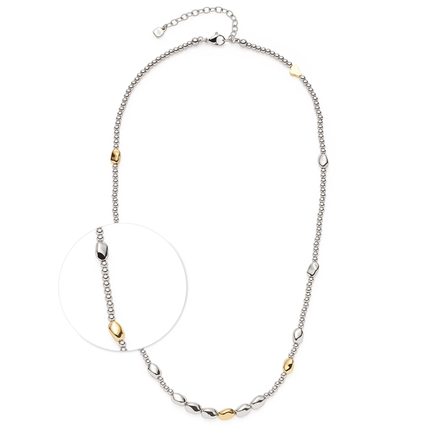 Die Halskette VEJA begeistert mit ihrer feinen Interpretation des Two Tone Trends. Polierte Metallkugeln in Silber werden unregelmäßig von kleinen Nuggets in Silber und Gold durchbrochen, was der Kette eine elegante, aber zurückhaltende Bicolor-Optik verleiht. Ein besonderes Detail setzt eine kleine, goldfarbene Schmuckplakette im Nackenbereich. Die kurze Kette lässt sich dank Karabinerverschluss und Verlängerungskette flexibel anpassen – perfekt für moderne Looks, die dezente Eleganz und Vielseitigkeit vereinen.