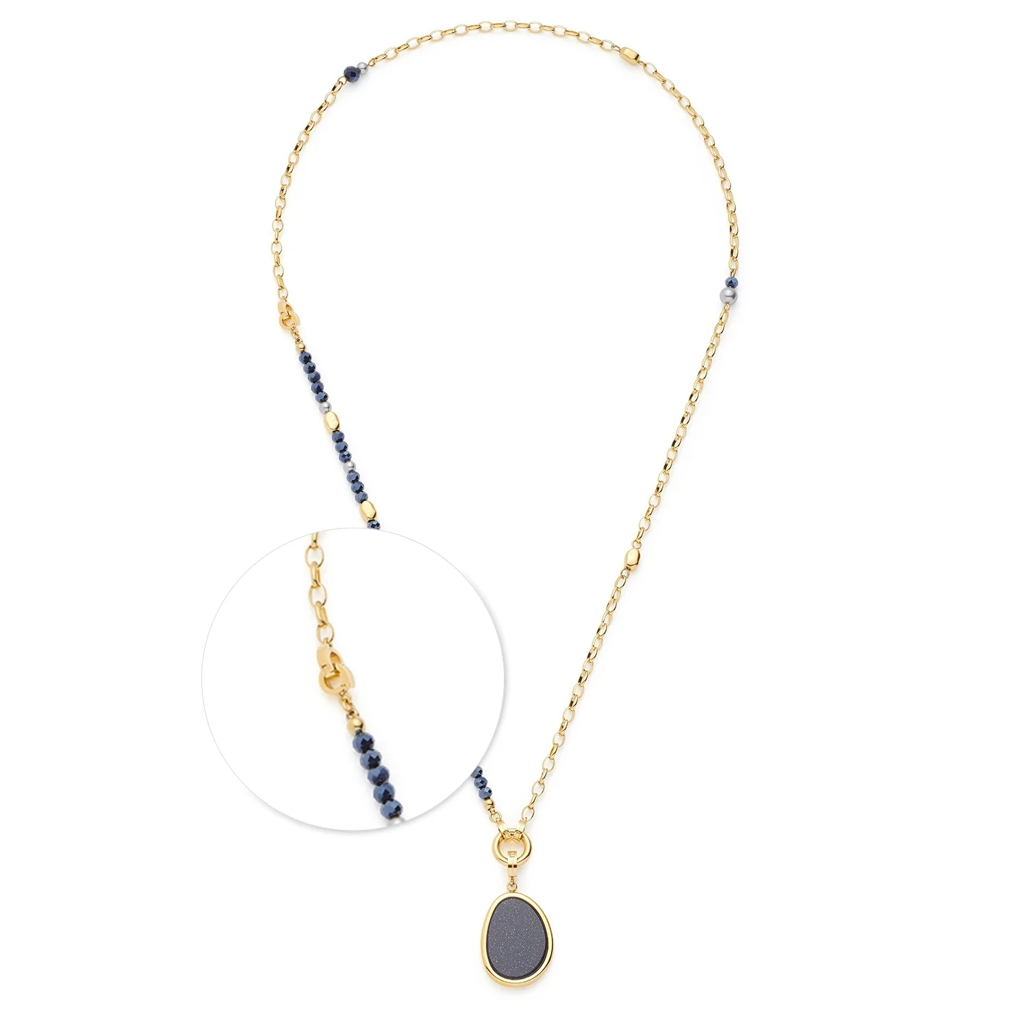 Mit dem Set CHARLENE bringst Du pure Wandelbarkeit in Deinen Schmuck-Alltag. Die elegante Weitankerkette aus poliertem Edelstahl mit goldener Ionenplattierung wird durch schimmernde Nuggets, nachtblau funkelnde Glasschliffperlen und sanft graue Akzente zum echten Blickfang. Das Besondere: Dieses Set vereint Kette, Armband und Anhänger in einem – und dank der praktischen Clip & Mix Funktion kannst Du im Handumdrehen bis zu fünf verschiedene Styles kreieren. Der organisch geformte Anhänger mit geheimnisvollem Blaufluss-Stein verleiht Deinem Look eine moderne, aber zugleich natürliche Note. Ob solo, im Set oder kombiniert mit weiteren Schmuckstücken – CHARLENE passt sich Deinem Stil immer wieder neu an.