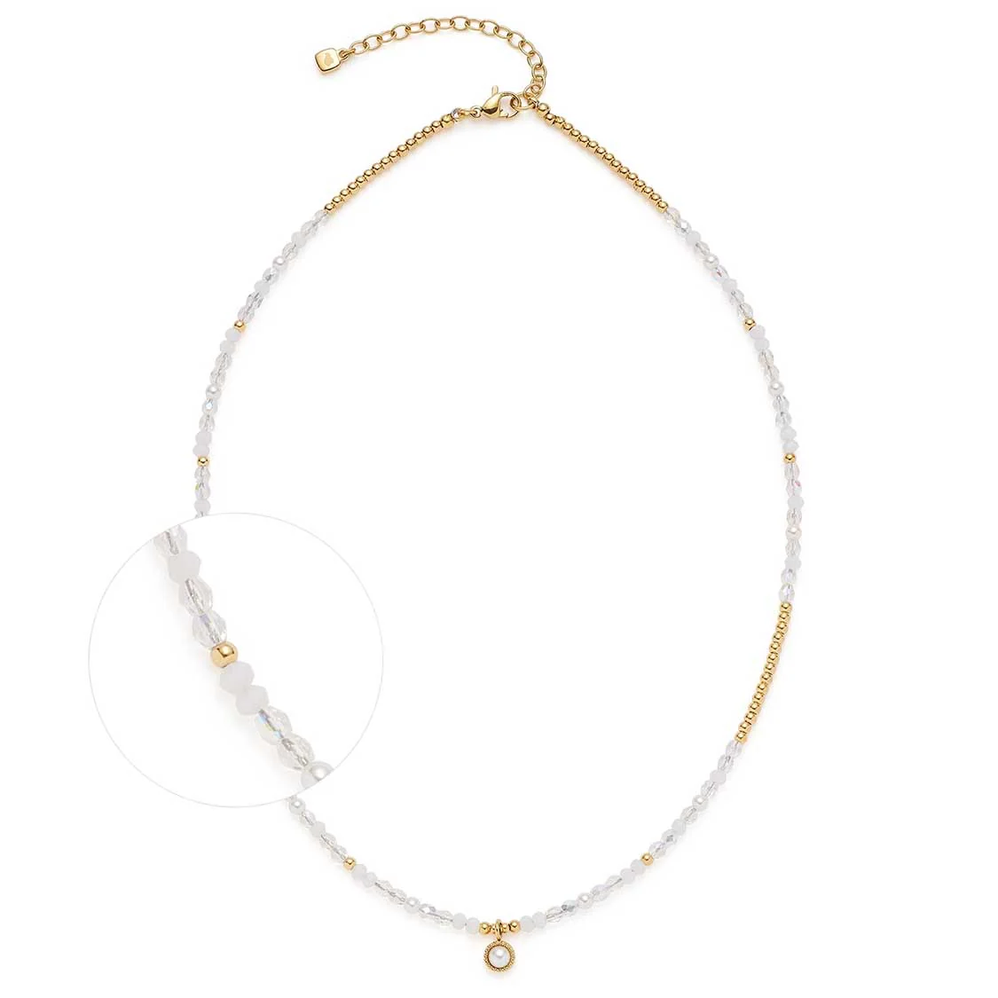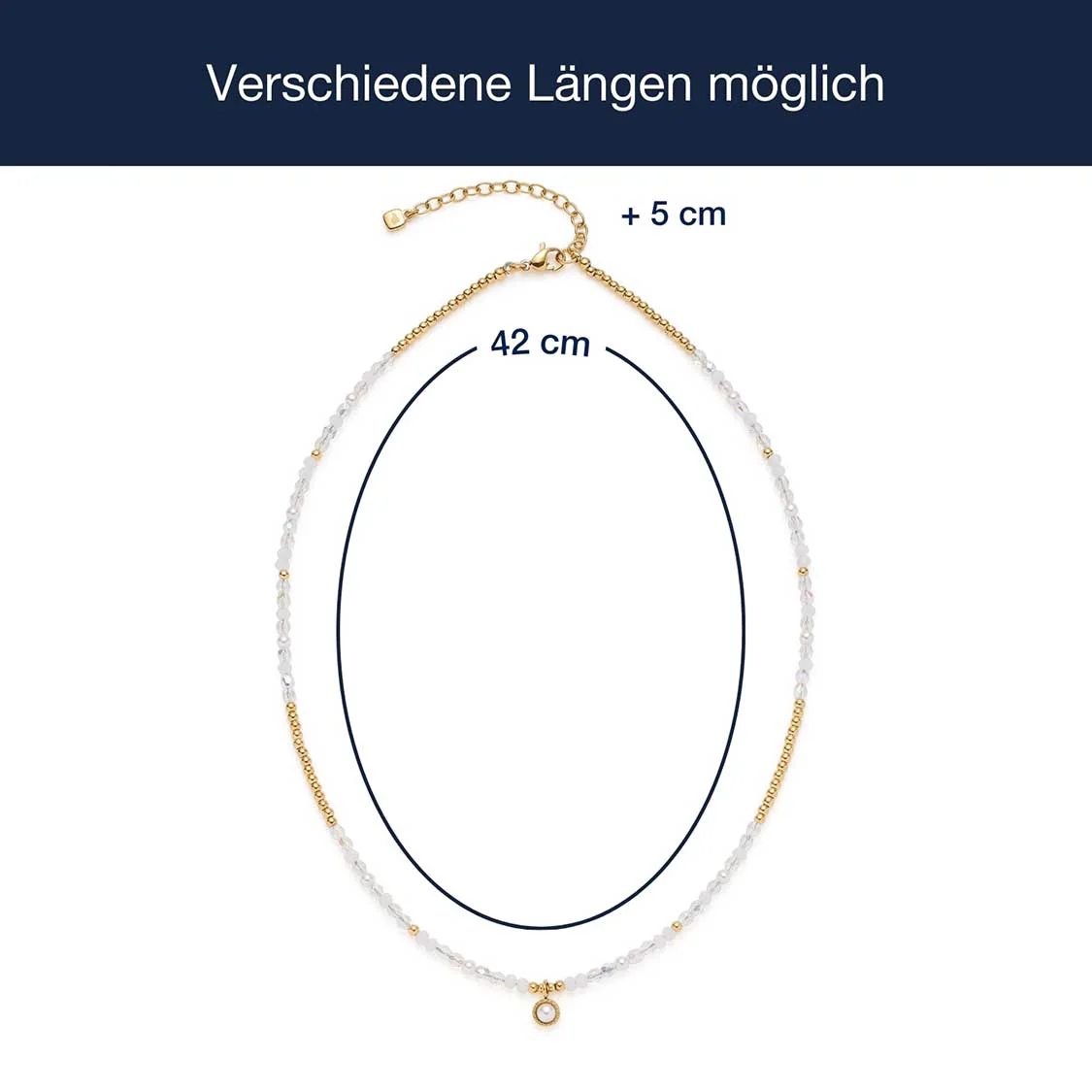 Die Halskette ALTHINA verkörpert stilvolle Leichtigkeit und dezente Eleganz – inspiriert vom Romantic-Trend. Die kurze Kette aus poliertem Edelstahl mit goldfarbener Veredelung kombiniert kleine Goldkugeln mit glitzernden, transparenten Glasperlen und natürlich wirkenden weißen Perlen. Im Mittelpunkt steht ein Anhänger mit einer weißen Perle, eingefasst in eine fein strukturierte Goldfassung, die dem Design eine besondere Note verleiht. Der sanfte Kontrast zwischen Gold und Weiß sorgt für einen edlen Look mit zeitlosem Charme. Dank Karabinerverschluss mit Verlängerungskette lässt sich die Länge flexibel anpassen. Die Halskette ALTHINA ist ein vielseitiger Begleiter, der jeden Stil unterstreicht – dezent, elegant und modern.