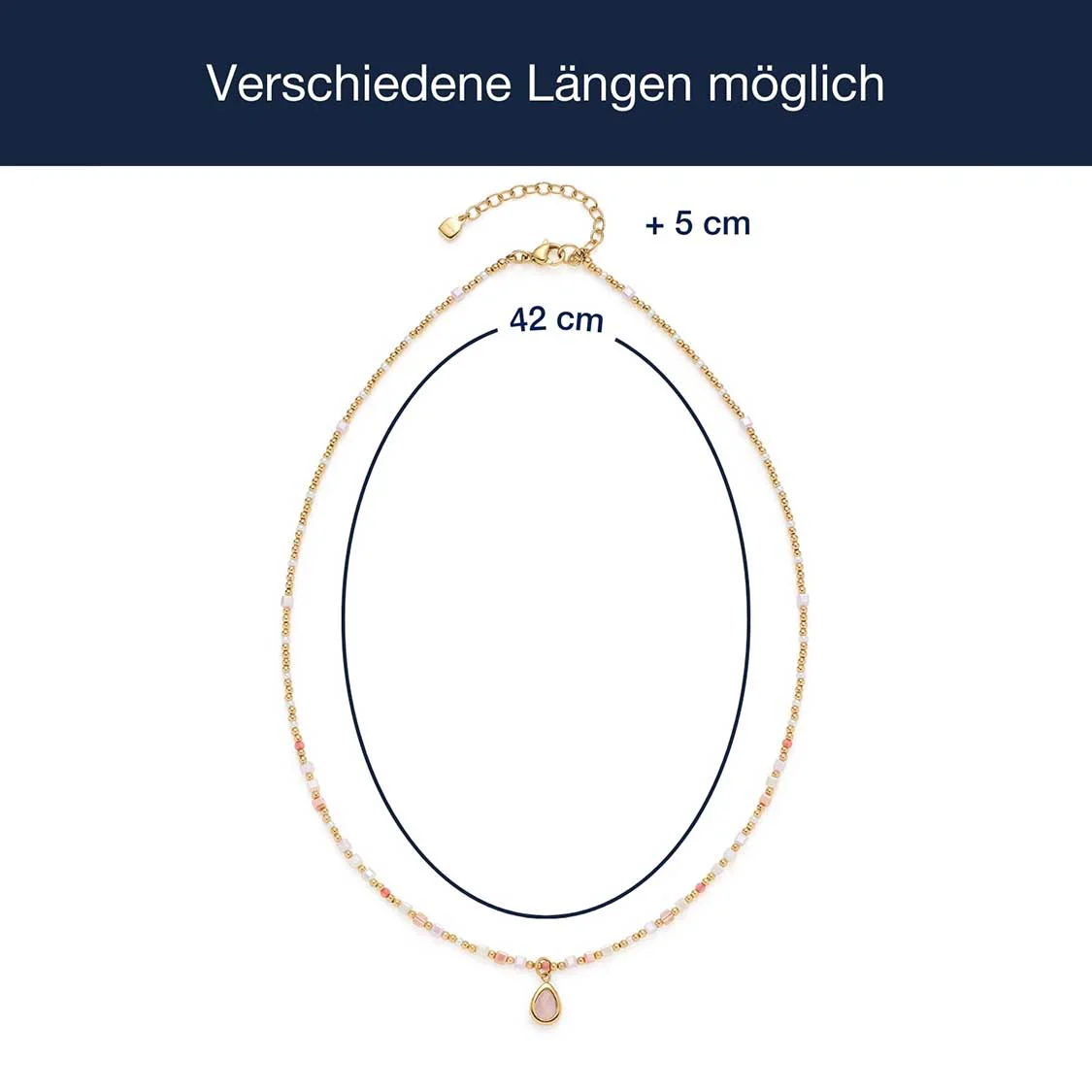 Die Halskette SHARI fängt den zarten Romantic-Trend perfekt ein und verleiht jedem Look eine sommerlich-leichte Note. Die kurze Kette aus poliertem Edelstahl mit goldfarbener Veredelung kombiniert kleine Goldkugeln, Perlen in Pastellrosa, Weiß und Apricot sowie natürlich wirkende weiße Perlen zu einem harmonischen Farbspiel. Im Mittelpunkt steht ein facettierter Glastropfen in zartem Rosé, eingefasst in einen schmalen Goldrahmen – ein eleganter Blickfang, der Licht wunderschön reflektiert. Winzige Akzente in Orange verleihen dem Design eine frische, lebendige Ausstrahlung. Mit Karabinerverschluss und Verlängerungskette lässt sich die Länge individuell anpassen. Die Halskette SHARI ist ein idealer Begleiter für den Alltag oder besondere Anlässe – dezent, modern und voller Leichtigkeit.