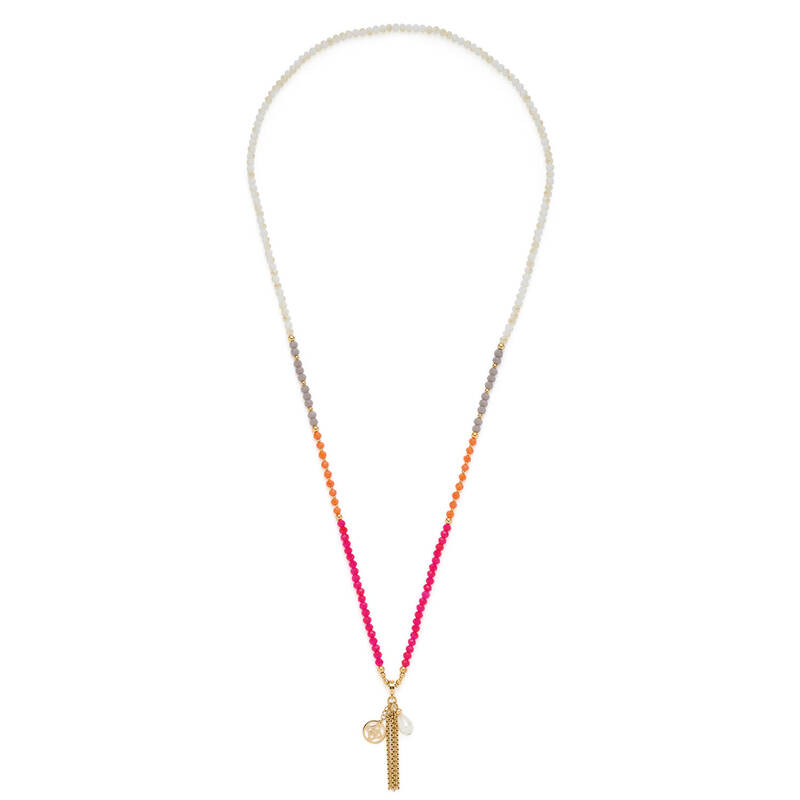 Die Kette SOLERA versprüht mit ihrem farbenfrohen Design sommerliche Lebensfreude. Die Endloskette aus poliertem Edelstahl mit goldener Ionenplattierung besteht aus abwechselnden Segmenten mit weißen, grauen und orangen Glasperlen, die durch kleine, glänzende Metallkugeln ergänzt werden. Für frische Farbakzente sorgen zusätzliche rosa Perlen, die der Kette einen modernen und femininen Look verleihen. Durch das harmonische Farbspiel und den fließenden Verlauf entsteht ein einzigartiger, lebendiger Stil, der sich ideal mit anderen Schmuckstücken kombinieren lässt.