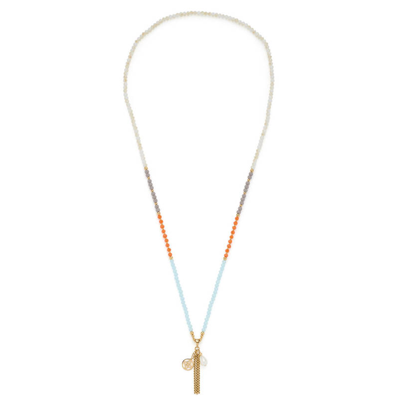 Die Kette SOLERA verbindet sommerliche Leichtigkeit mit edler Farbwirkung. Die Endloskette aus poliertem Edelstahl mit goldener Ionenplattierung zeigt ein harmonisches Zusammenspiel aus weißen, grauen und orangen Glasperlen, die durch kleine, zart hellblaue Akzente veredelt werden. Zarte, goldglänzende Metallkugeln zwischen den Perlen verleihen dem Design eine feine Struktur und betonen die Hochwertigkeit des Materials. Die fließende Form ohne Verschluss sorgt für ein angenehmes Tragegefühl und lässt die Kette elegant am Dekolleté liegen – ideal für sonnige Tage und moderne Looks.