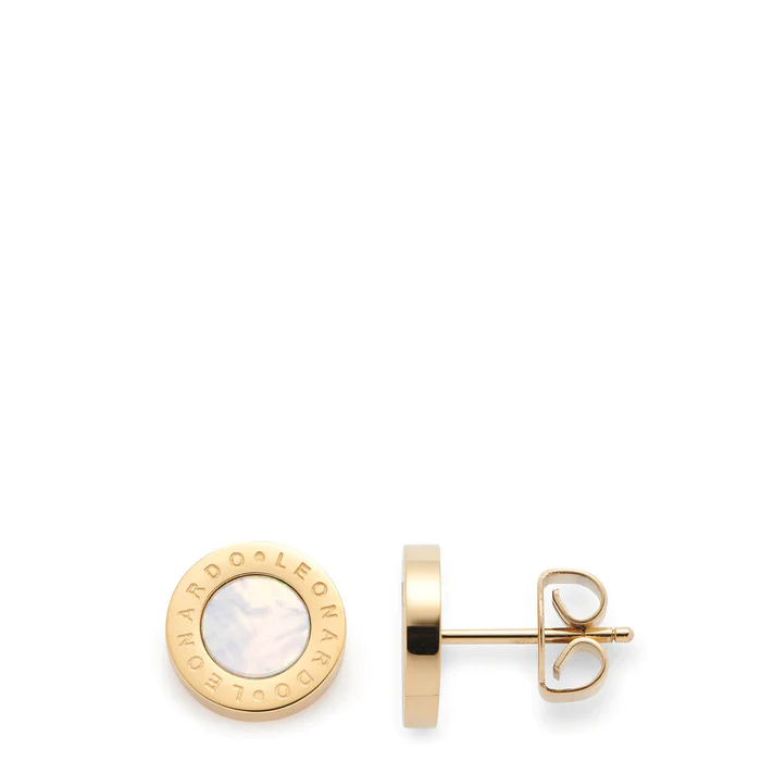 Stilvoll treten die Ohrstecker aus goldfarben ionenplattiertem Edelstahl in Erscheinung. Um die eingelassene Scheibe aus schimmerndem Perlmutt ist ein Leonardo-Schriftzug eingraviert.
