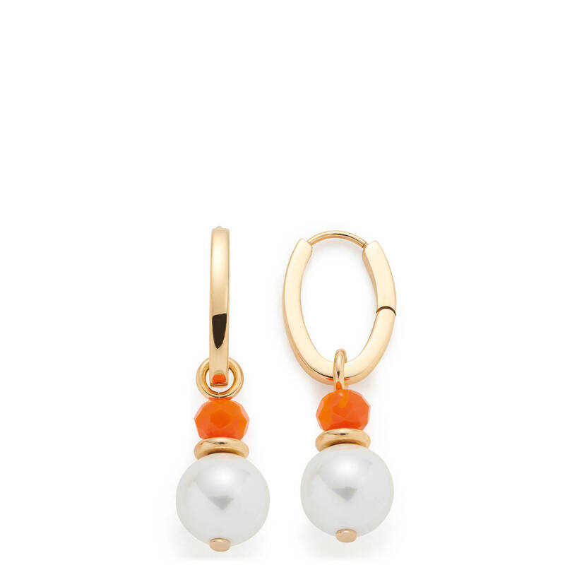 Die Ohrringe SOLERA vereinen sommerliche Frische mit elegantem Design. Die V-förmigen Klappcreolen aus poliertem Edelstahl mit goldener Ionenplattierung tragen abnehmbare Anhänger, die aus einer natürlich wirkenden weißen Perle, einer goldenen Scheibe und einer kleinen Glasperle in Orange bestehen. Diese feine Farbkombination wirkt stilvoll, feminin und zugleich modern. Dank der abnehmbaren Anhänger kannst du die Creolen wahlweise schlicht oder farbenfroh tragen – perfekt für vielseitige Looks von lässig bis elegant.