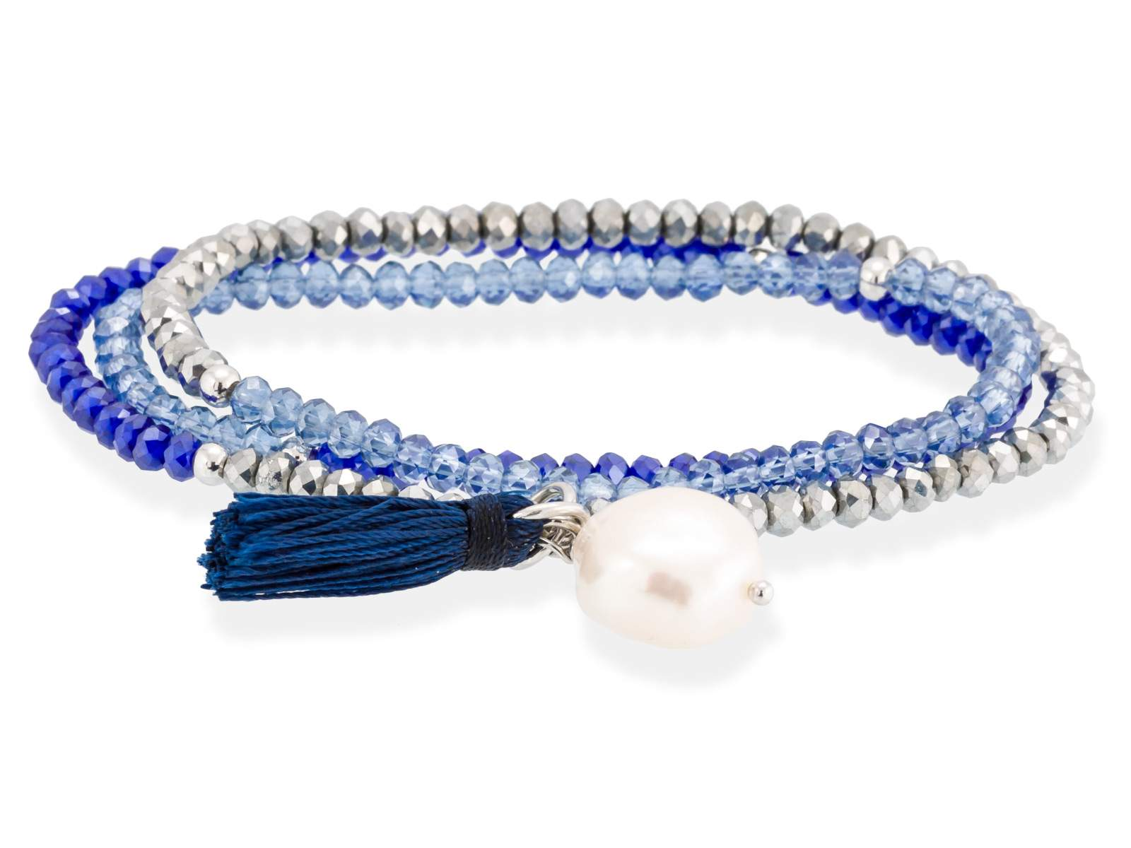 Armband in Silber (925) rhodiniert mit Facettierten "Dreifach -blau" Farbe Strass und Süßwasser-Zuchtperle. (Länge: 54 cm)