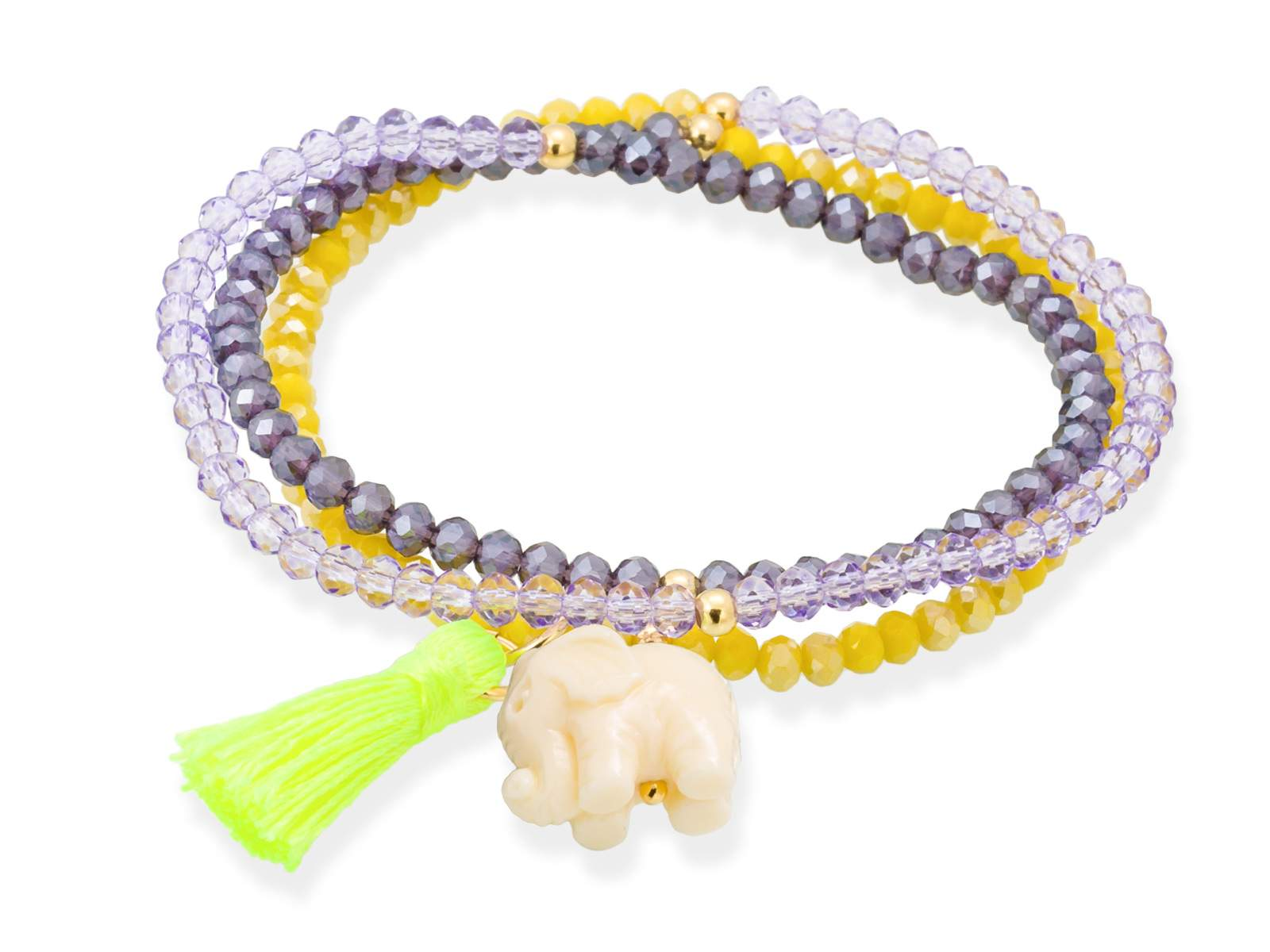 Armband in Silber (925) vergoldet in 18 Karat Gelbgold, mit elastischem Silikonband und facettiertem Strassglas, mit Elefant schnitzen Harz. Größ 18 cm. (54 cm insgesamt)
