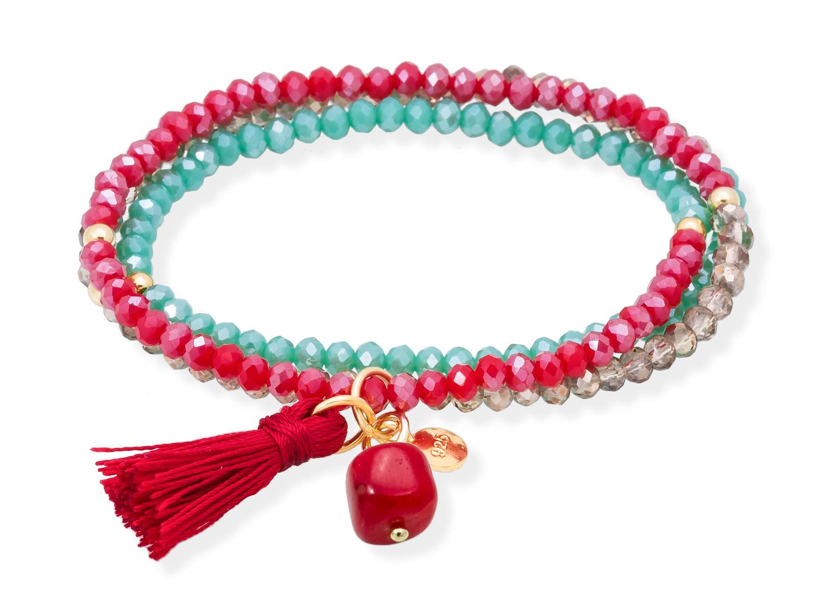 Armband in Silber (925) vergoldet in 18 Karat Gelbgold, mit elastischem Silikonband und facettiertem Strassglas, mit Naturstein. Mittel 17 cm. (51 cm insgesamt)