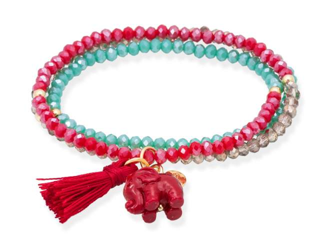 Armband in Silber (925) vergoldet in 18 Karat Gelbgold, mit elastischem Silikonband und facettiertem Strassglas, mit Elefant schnitzen Harz. Mittel 17 cm. (51 cm insgesamt)