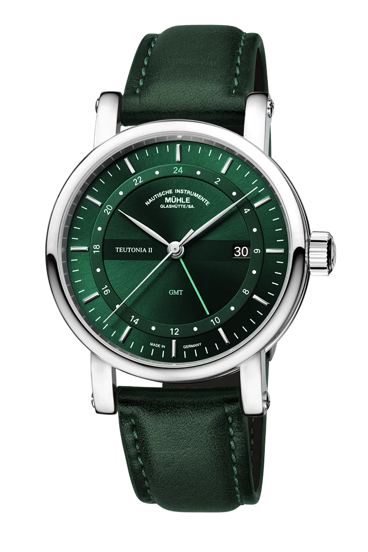 Die Teutonia gehört zu den bekanntesten Armbanduhren von Mühle-Glashütte. Im Jahr 2002 wurde die erfolgreiche Uhrenfamilie vorgestellt. Ihr jüngstes Mitglied ist die Teutonia II GMT, die ihren Träger in stilvollem Grün über die genaue Ortszeit und die Uhrzeit in einer zweiten Zeitzone informiert.