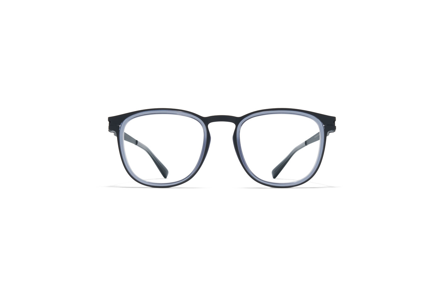 CANTARA in der Farbe A62 Indigo/Deep Ocean mit Clear Gläsern aus der MYKITA ACETATE RINGS Kollektion ist eine eckige Korrekturbrille aus Edelstahl mit Acetat-Ringen. Handgefertigt in Berlin.