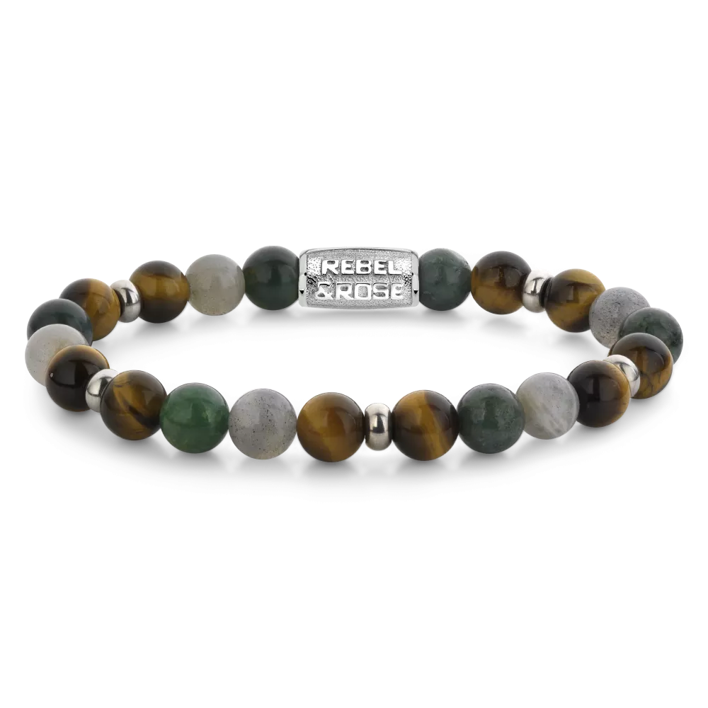 Perlenarmband, handgefertigt aus 8 mm Steinen (Stainless Steel, Tiger Eye Yellow, Moss Agate, Labradorite) mit einem silberfarbenen Verschluss.
