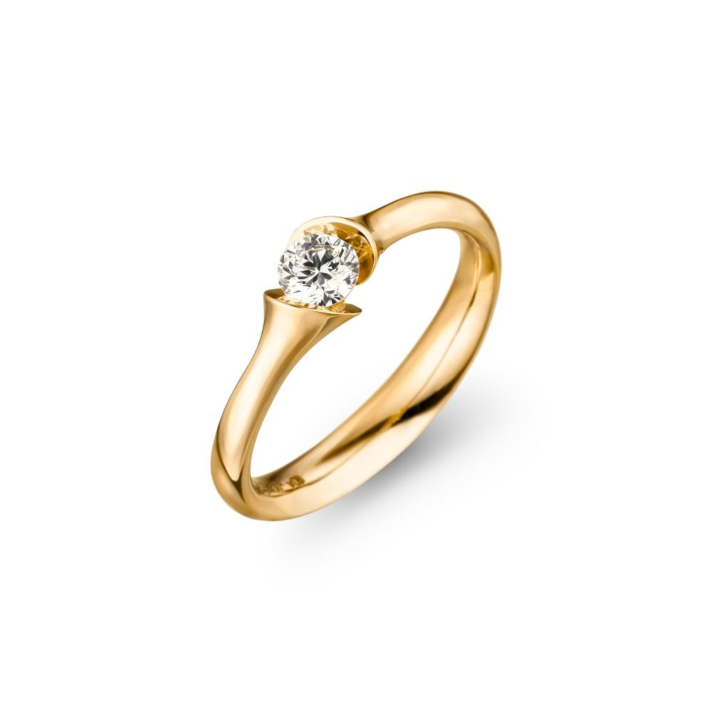 Völlig schwerelos scheint der Diamant wie in einer Blüte zwischen zwei kelchförmigen goldenen Blütenblättern zu schweben. Hochglänzende Spiegelflächen, die im spannenden Kontrast zum feinen Matt der Ringschiene stehen, ermöglichen eine besonders funkelnde Lichtreflexion und lassen den Stein magisch strahlen. Die sich sanft verjüngende Ringschiene verleiht dem Ring außergewöhnlichen Tragekomfort.