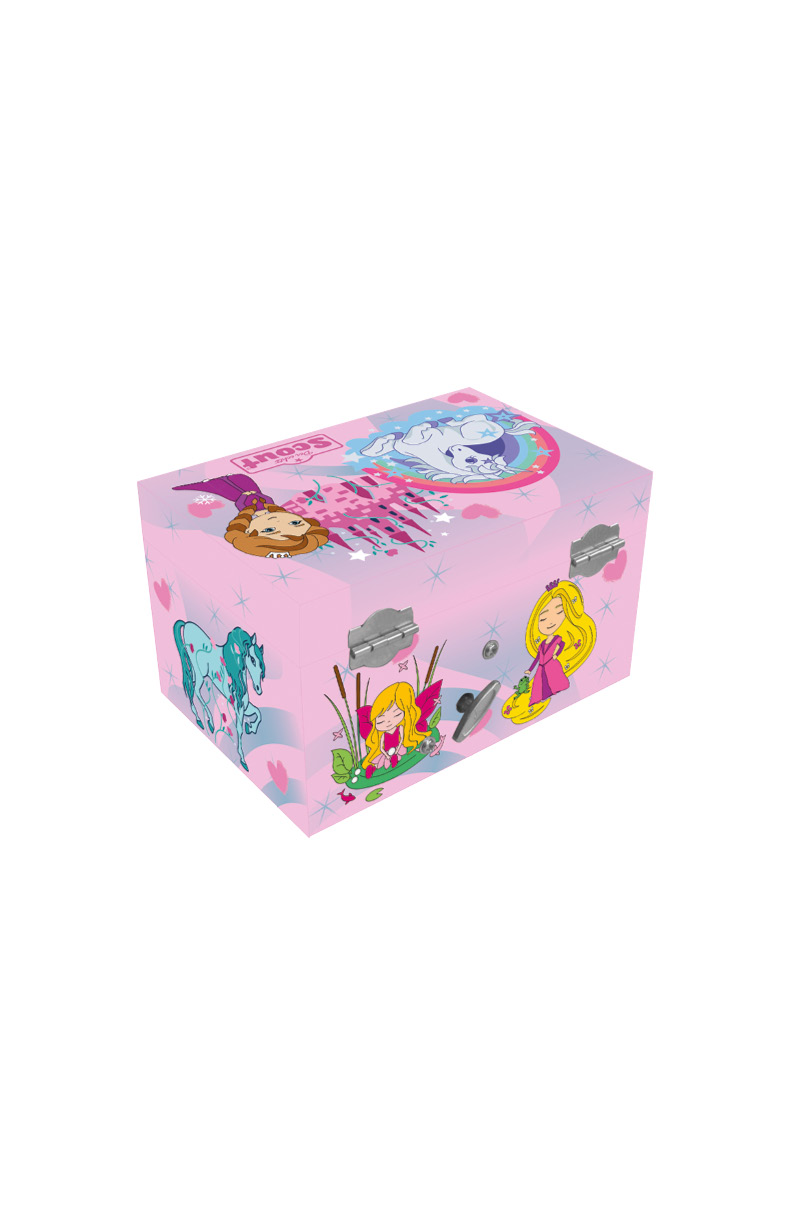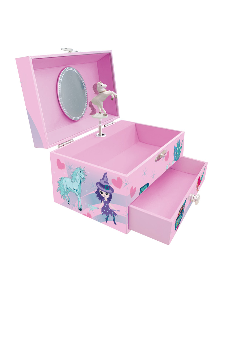 Dieses tolle Schmuckkästchen lässt Mädchenaugen aufleuchten. Es ist aus stabilem MDF gearbeitet. Die verwendeten Motive stammen allesamt aus verschiedenen Scout Schulranzen-Motiven. Das Einhorn im Innern dreht sich zu einer schönen Melodie. Ein großes Schmuckfach sowie eine ausziehbare Schublade sorgen für Ordnung, ein ovaler, mit Perlrand verzierter Spiegel findet im Deckel seinen Platz. Die Innenseiten sind mit einem weichem Stoff ausgeschlagen. Auf der Rückseite befindet sich eine Schraube zum Aufziehen des Musikwerkes – bitte vermeiden Sie hier ein Überdrehen der Schraube.