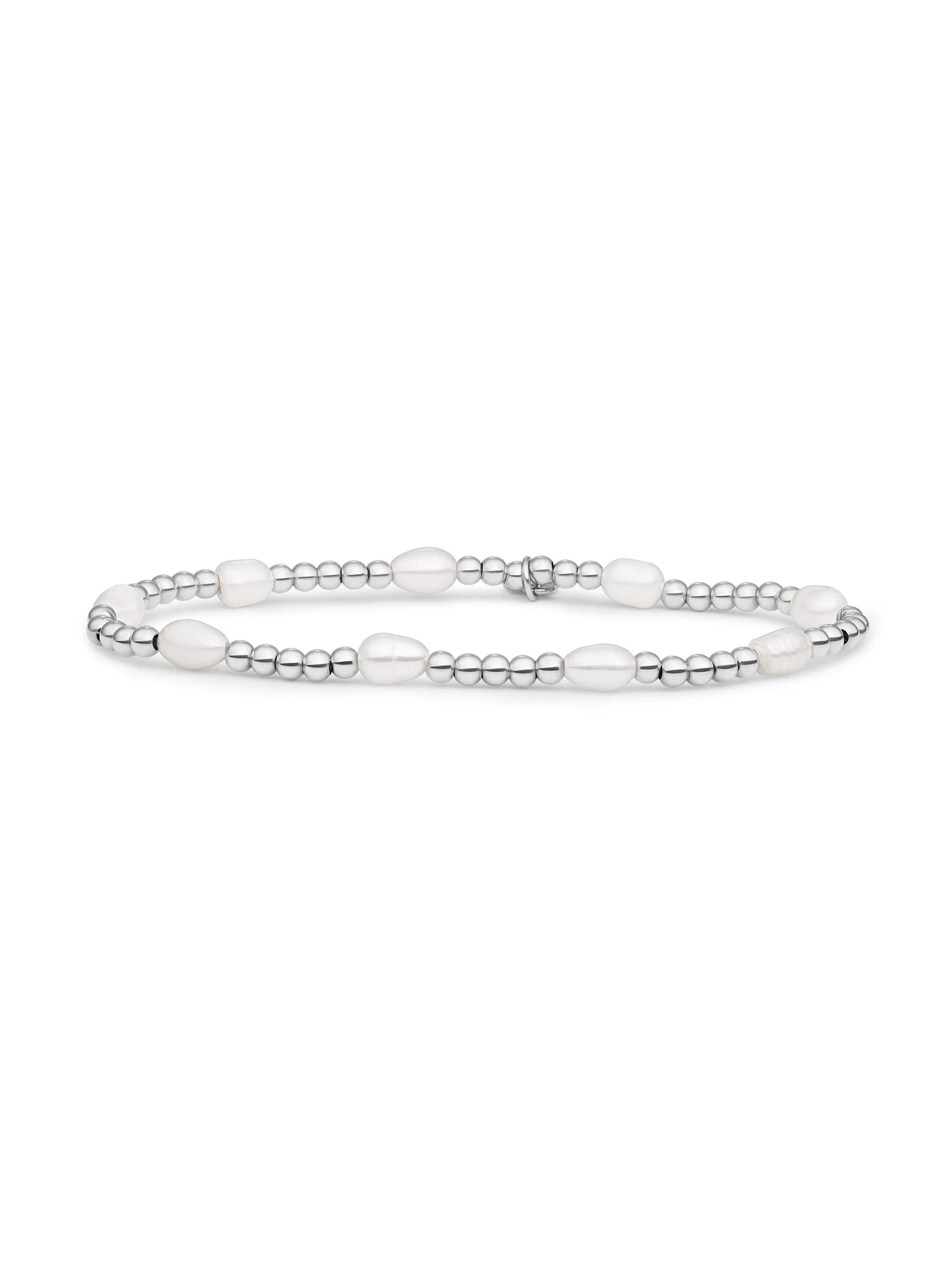 Reverse Roundel Armband, Perle, Silber. Dieses Armband ist eine Hommage an Balance und Klarheit. Die silberfarbene Basis verleiht ihm Kühle und Schimmer, während die Perlendetails für ein sanftes Lichtspiel sorgen. Das Ergebnis ist ein dezentes Funkeln, das Ihr Handgelenk veredelt – egal ob Sie einen minimalistischen oder einen Lagenlook bevorzugen. Kombinieren Sie es mit einer Uhr für einen modernen Mix. Tragen Sie verschiedene Texturen für Tiefe, ohne dass es schwer wirkt. Die glatte Oberfläche und die abgerundeten Formen garantieren Tragekomfort von morgens bis abends. Perlmutttöne harmonieren perfekt mit Denim, Seide und Strickwaren und verleihen jedem Outfit eine beruhigende Note. Ein zeitloses Design, das Ihre Schmucksammlung mit einer persönlichen, strahlenden Note bereichert.