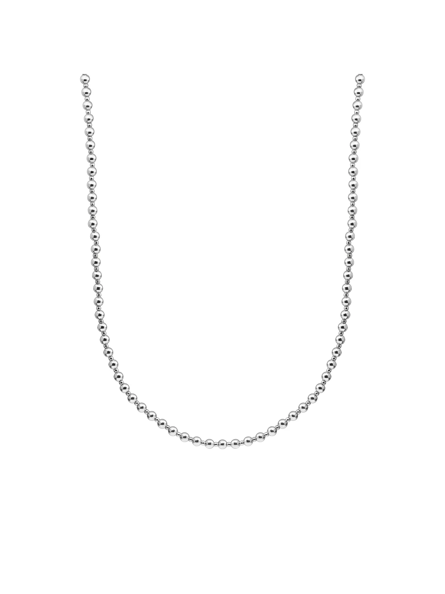 Silberne Perlenkette (2 mm + 4 mm). Diese Kette spielt mit Textur, indem sie 2 mm und 4 mm große Perlen in einem sanften Rhythmus kombiniert. Die silberne Farbe reflektiert das Licht sanft und verleiht Ihrem Dekolleté einen frischen, modernen Look. Tragen Sie sie solo für minimalistische Eleganz oder kreieren Sie ein Lagen-Ensemble mit einer Kette und einem kleinen Anhänger für mehr Tiefe. Die glatte Oberfläche fühlt sich angenehm auf der Haut an und sorgt für hohen Tragekomfort von morgens bis abends. Kombinieren Sie die Kette mit Weiß, Grau und Marineblau für einen strahlenden Look oder setzen Sie mit Camel und Schwarz einen schicken Kontrast. Zeitlos, vielseitig und perfekt auf Ihren Stil abgestimmt.