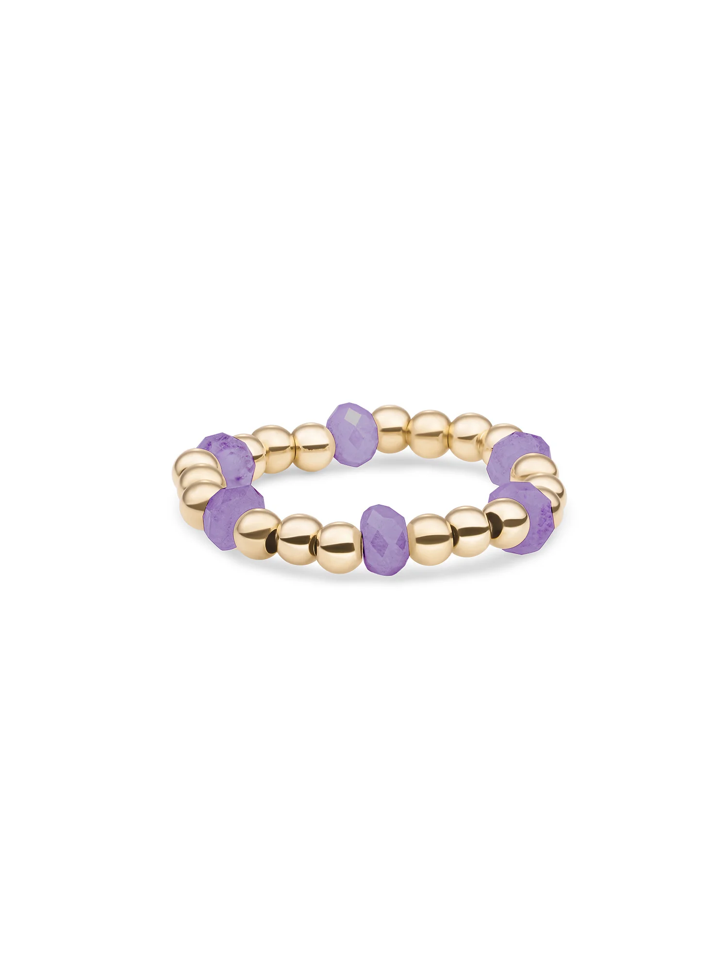 Facettierter Amethyst-Rondelle-Ring. Dieser Ring vereint Farbe und Textur in einem verspielten und zugleich raffinierten Design. Die facettierten Amethyst-Rondelle fangen das Licht ein und leuchten bei jeder Bewegung in einem hellen, violetten Schimmer. Die abgerundete Form sorgt für angenehmen Tragekomfort, auch an langen Tagen. Tragen Sie ihn solo für einen dezenten Blickfang oder kombinieren Sie ihn mit schmalen Ringen in Gold oder Silber für einen modernen Lagenlook. Der violette Farbton harmoniert wunderbar mit Weiß, Creme und Sand und verleiht Denim oder Schwarz eine elegante Note. Für einen harmonischen Kontrast können Sie die Farbe in einem kleinen Ohrstecker oder Armband aufgreifen. Die glatte und strapazierfähige Oberfläche garantiert, dass der Ring Saison für Saison schön bleibt. Eine zeitlose Wahl für alle, die ihren Alltagslooks – ob im Büro, am Wochenende oder beim Abendessen – eine persönliche und strahlende Note verleihen möchten. Kombinieren Sie ihn mit einer dezenten Maniküre in Flieder oder Nude für ein harmonisches Gesamtbild.